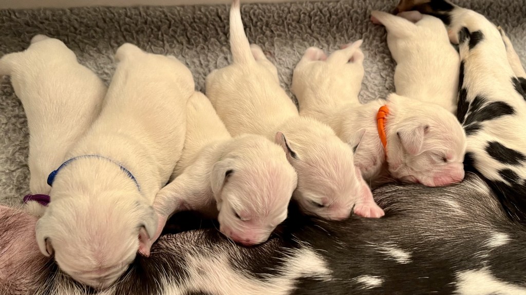 ENS went well today. No huge change between yesterday and today, but it does seem that everyone is much more settled into a routine and Tipsy is continuing her motherly duties. She has always loved to lay with the puppies even when they are not nursing.