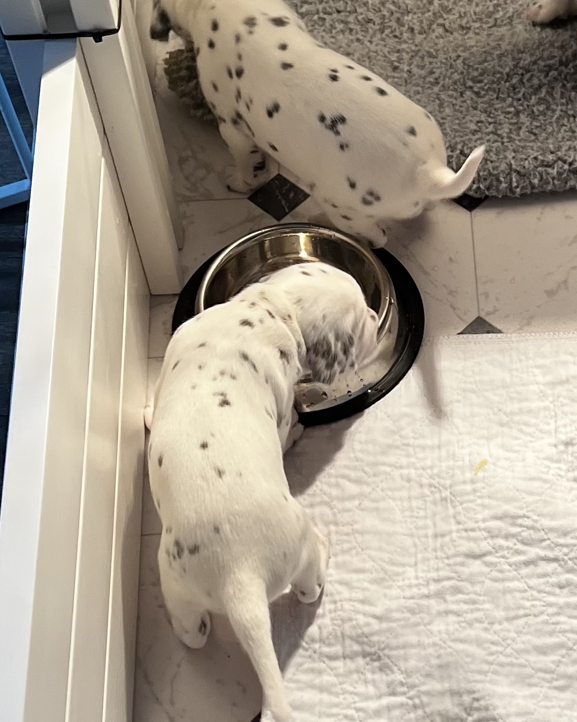 Our new item today was the water bowl. There are no specific cues that the puppies are ready for water, as they are still getting all of their nutrition and hydration from Tipsy at this point, but it is around the time that they start to lap liquids and learn how to drink on their own. All we do is put a low disk of water in their box. They will do everything you can think of with it until they eventually start to drink it. All normal for their age.