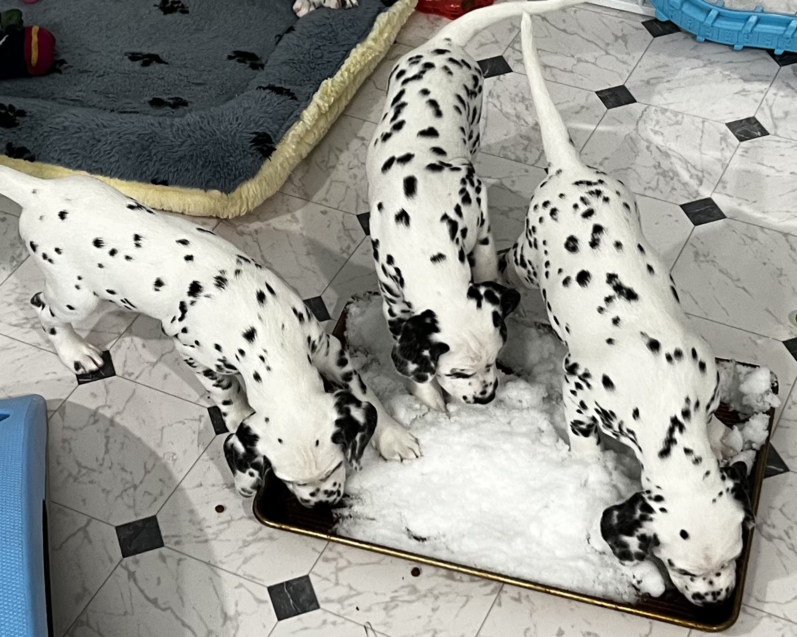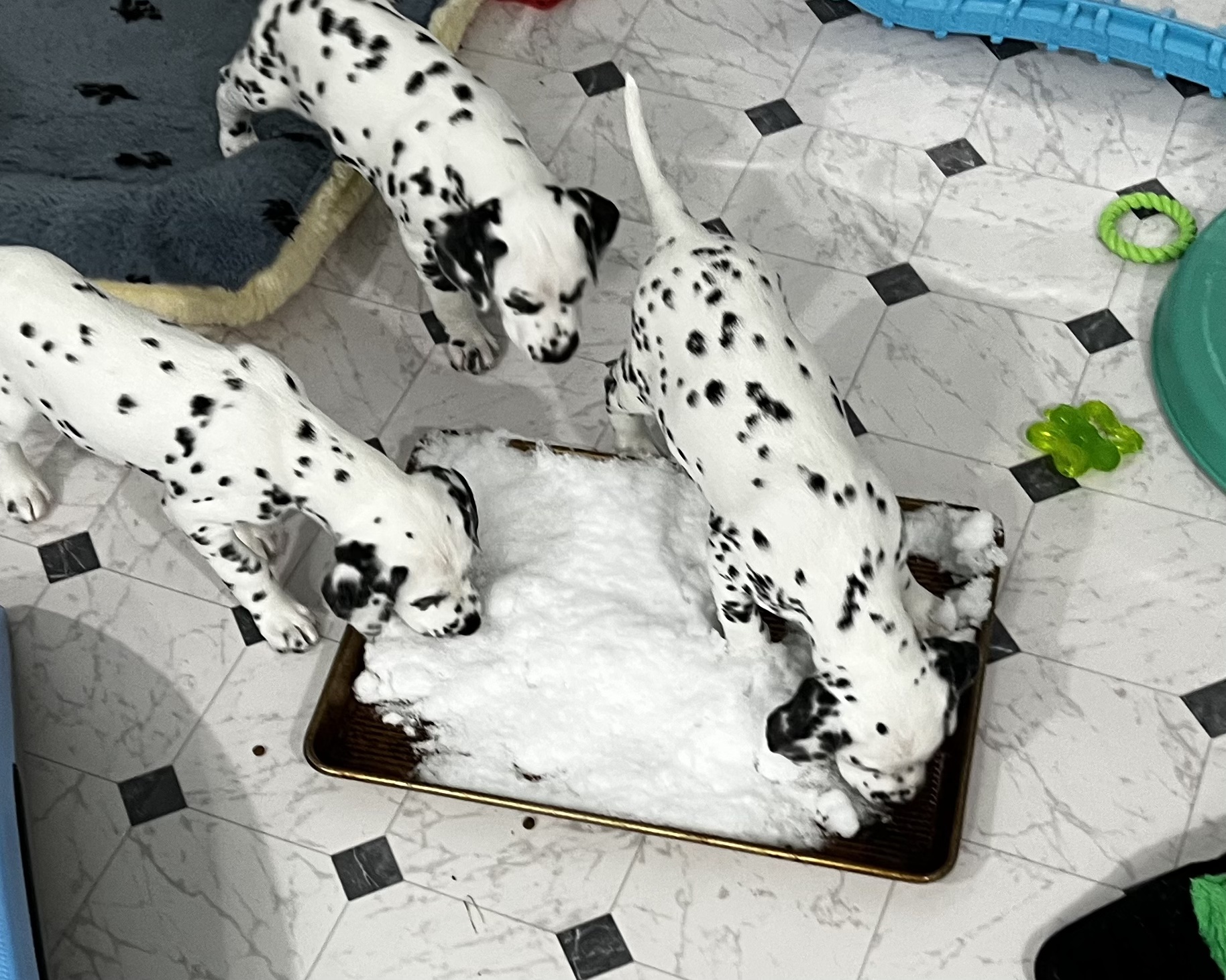 Since it it much too cold to go outside with the puppies, we decided to bring the outdoors in. I took a sheet pan right off of the patio, and let some snow collect before bringing it in for the puppies to explore. They thought that it was a bit cold at first, but then realizes that it was fun to eat the very bland snow cone!