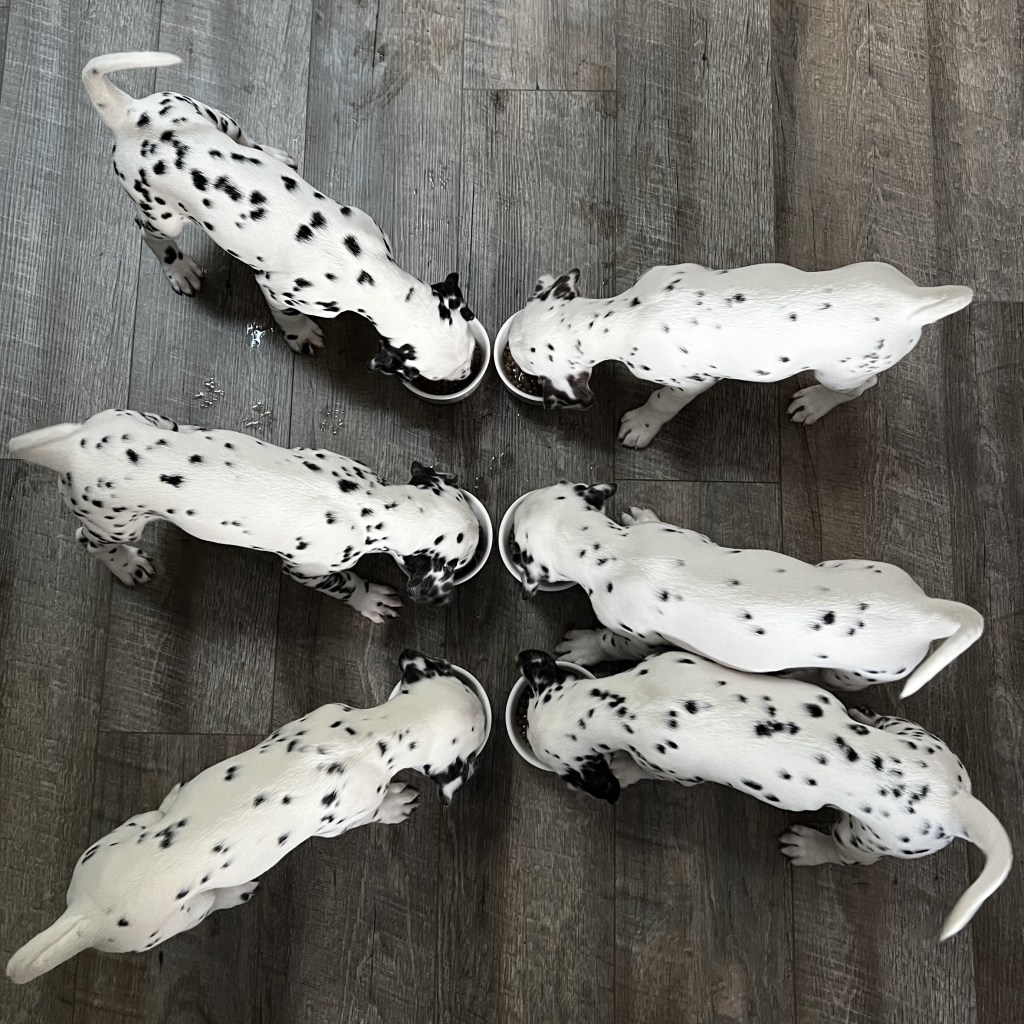One of the best things about feeding in individual bowls is being able to put the puppies into their own shapes. I know that that sounds funny at first, but we are bale to put then into a circle like they were still eating out of the saucer, a square, rectangle, a straight line, pretty much anything that you can imagine is possible.