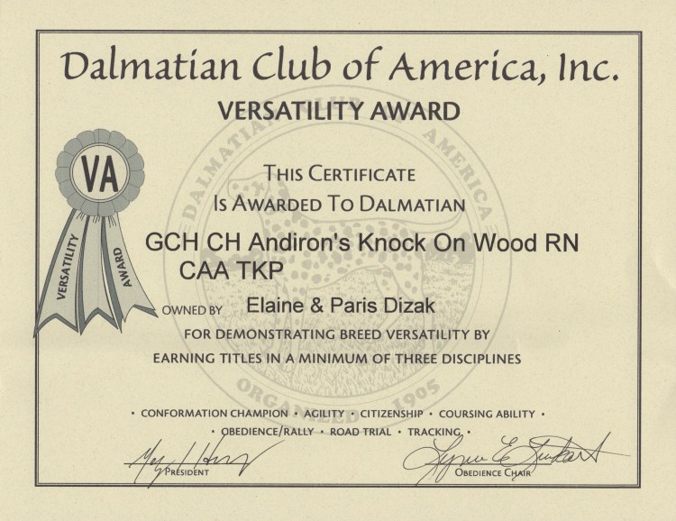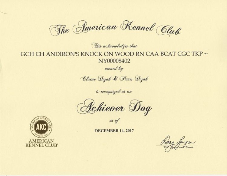 GCH ANDIRON’S KNOCK ON WOOD RN FDC CAA BCAT CGC TKE VHMA VSWI FITS