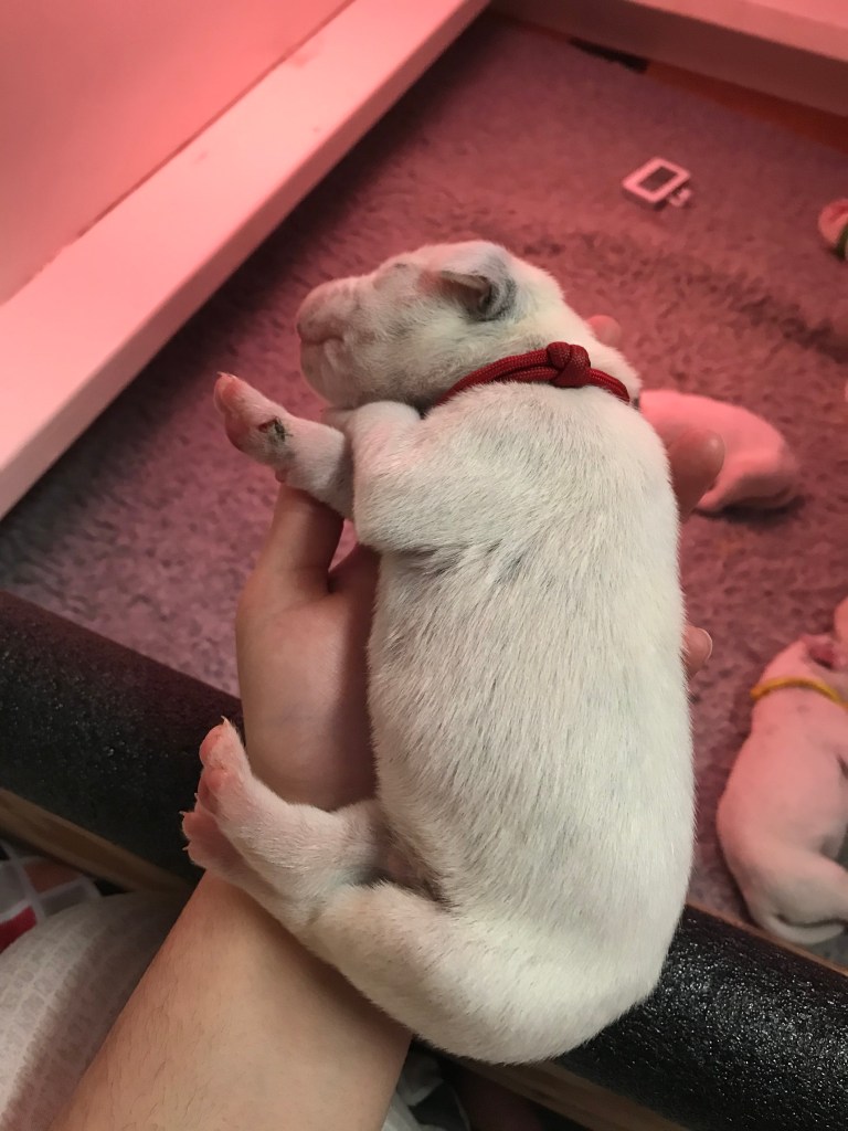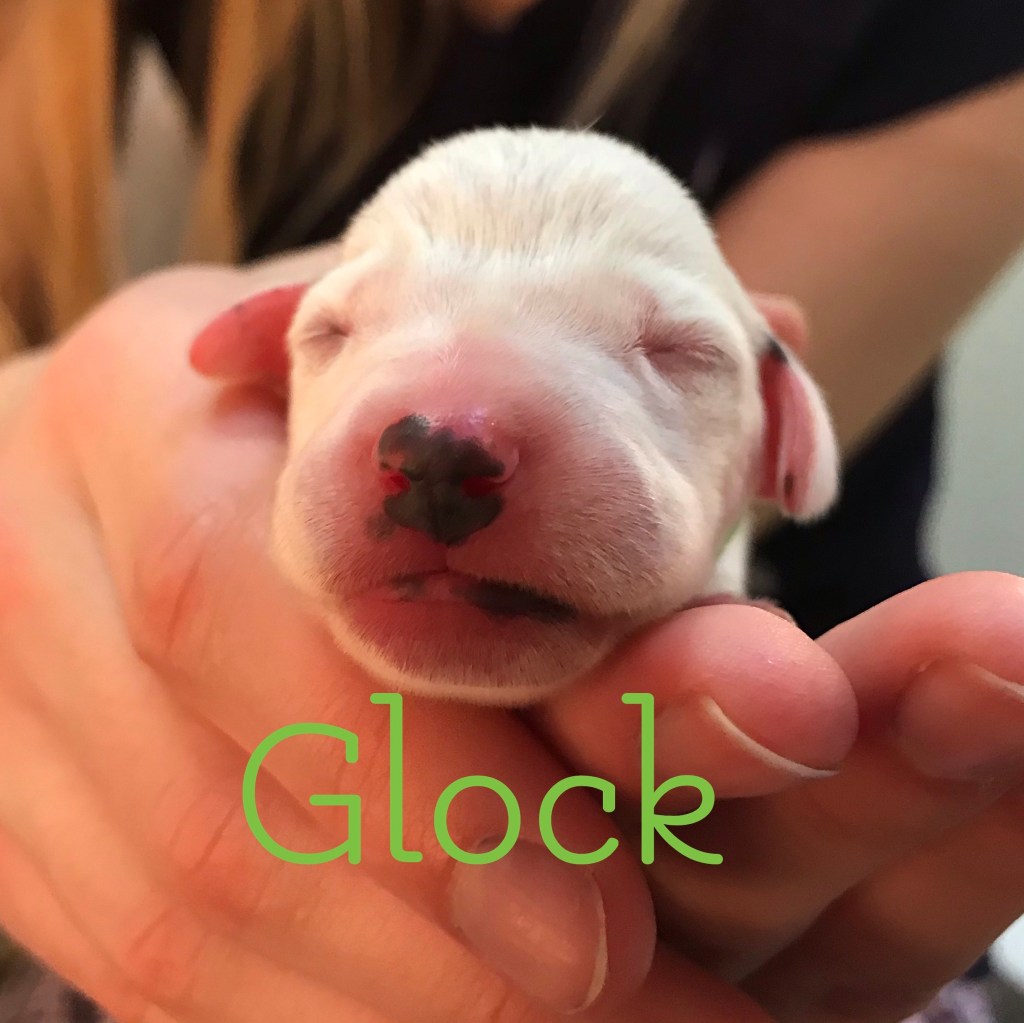 Not too many changes today. ENS went well and I still have to say that Raven is by far the most active puppy. We did see some of the pups up on all fours and will try to get a better video. I couldn’t get a good picture because they were a bit wiggly. Here is Glock going collarless for a few hours tonight.