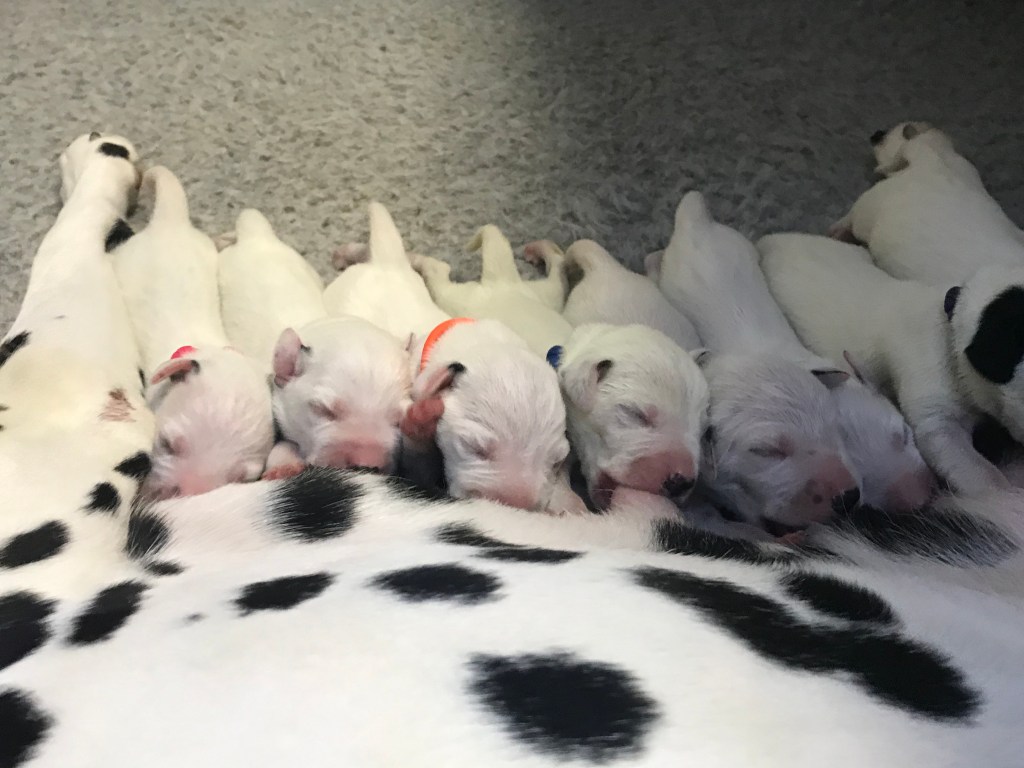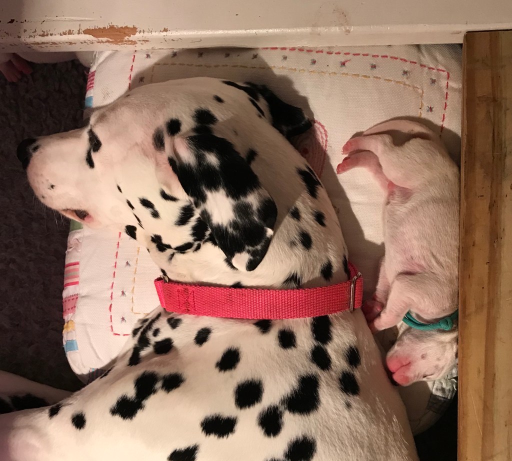 Not too much going on today, other than some visitors that Kimber is very comfortable with as she has known them since she came home from her breeder’s house. (LaDonna King: Kingdom Dalmatians) Once Kimber is more comfortable with strangers coming to visit her babies, we can have outside visitors too, which usually start around 3-4 weeks old depending on when they start to wean.