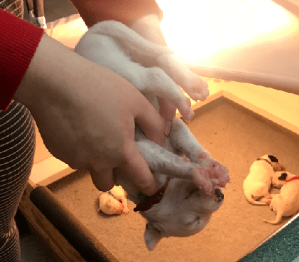 | 4. Supine position Hold the pup so that its back is resting in the palm of both hands with its muzzle facing the ceiling. The pup while on its back is allowed to struggle. While also rubbing all parts of the pups body with your fingers. Time of stimulation 5-10 seconds | |