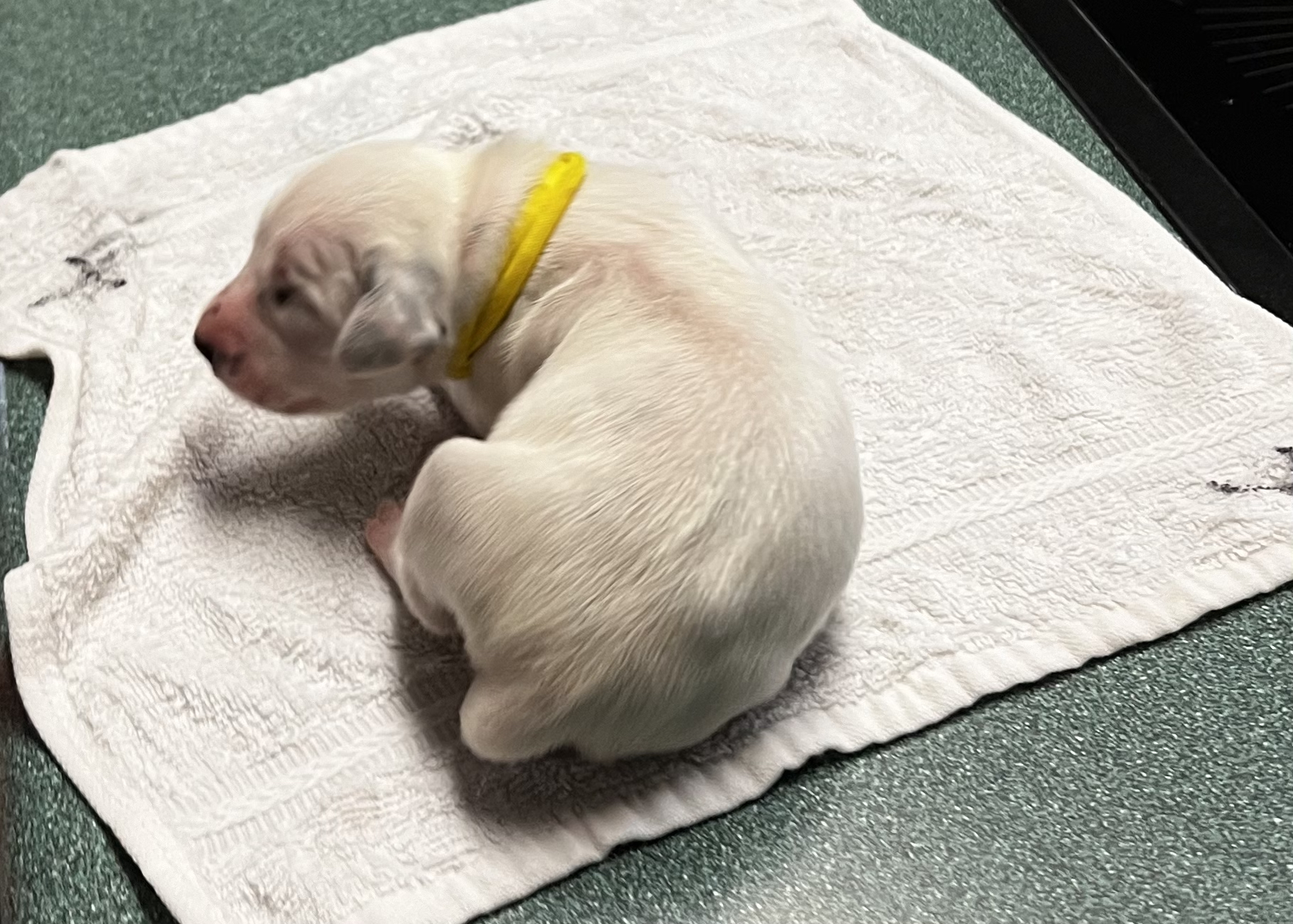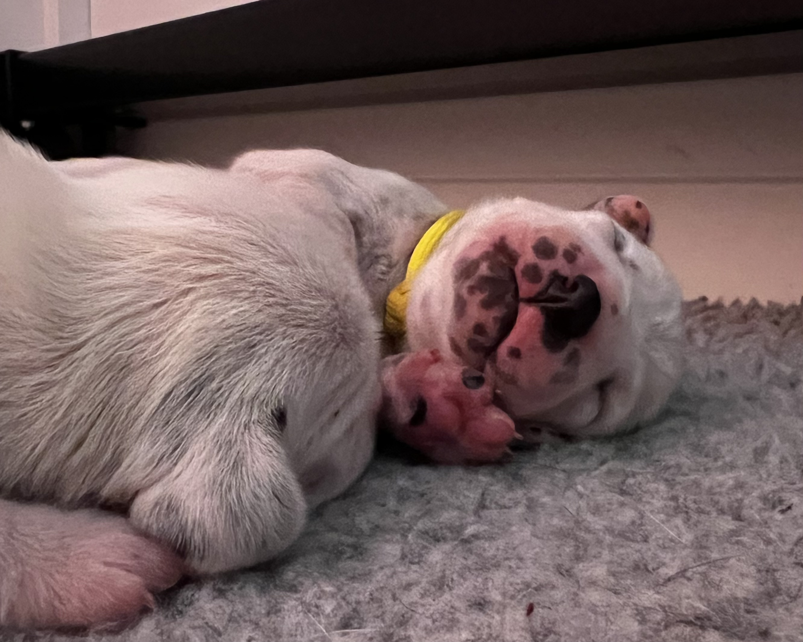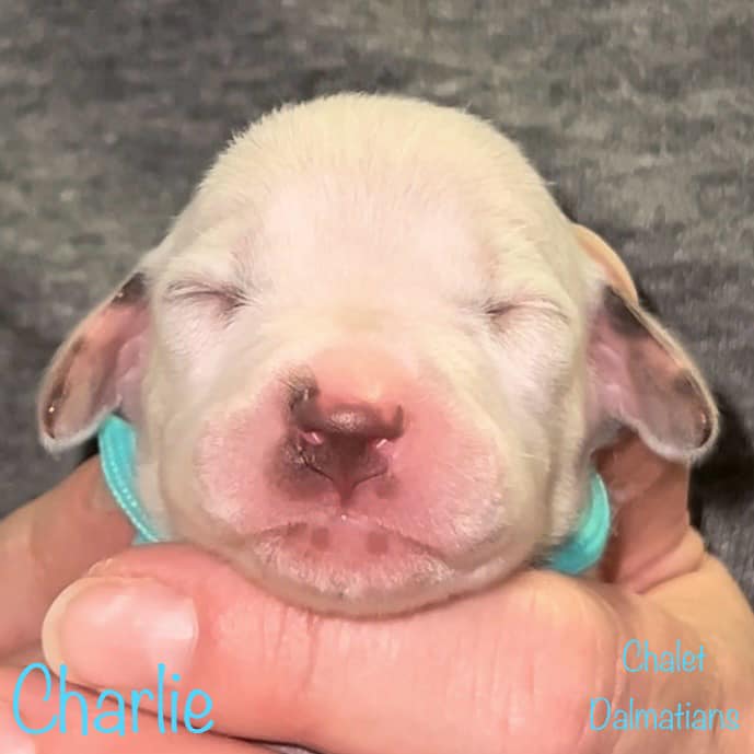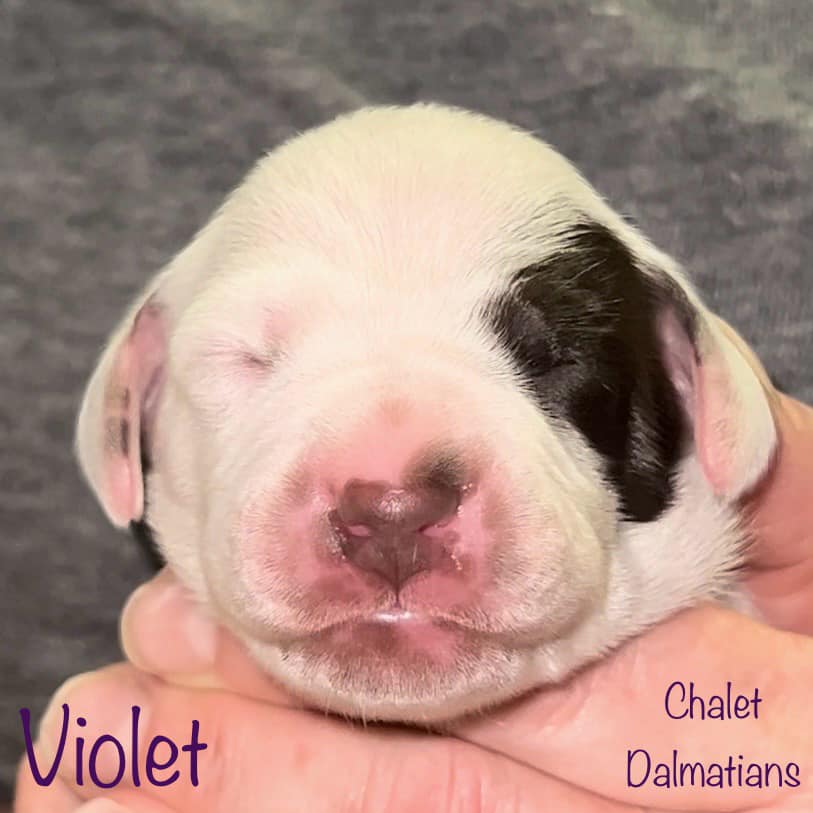 It is thought to be that Charlie and Violet are liver brown spotted puppies, which means that their marking will appear as a brown color instead of black. We are pretty excited about having some liver pups! All of the puppies will let us know for sure which color they are when they are a few days old because it can sometimes be hard to tell on newborns. Those are the two colors that are accepted by the American Kennel Club (AKC) and the United Kennel Club (UKC), which are the only reputable kennel clubs in the United States.