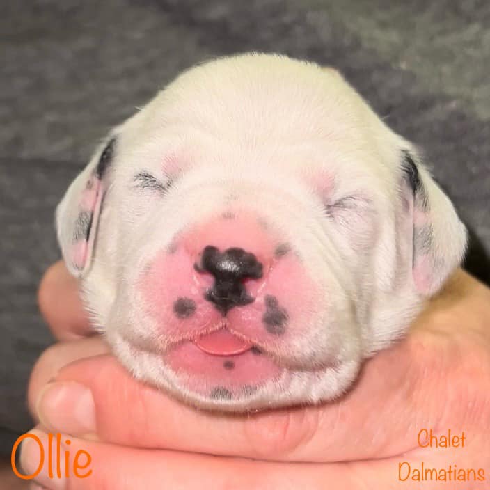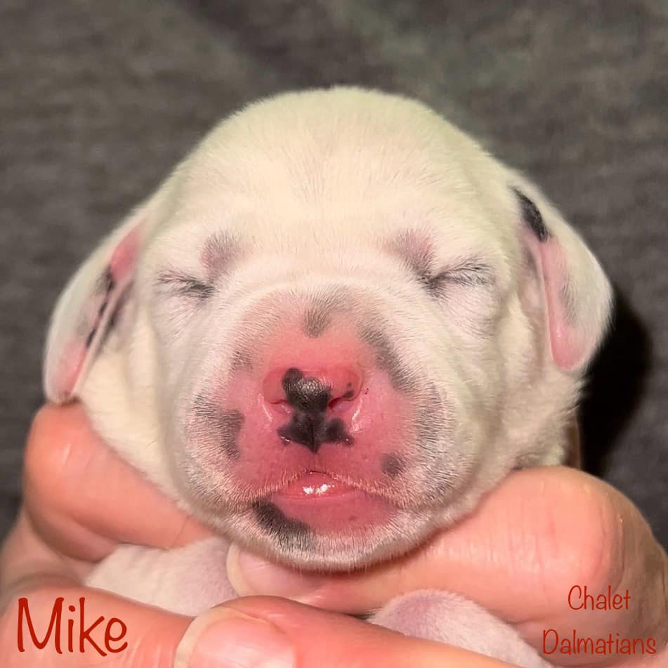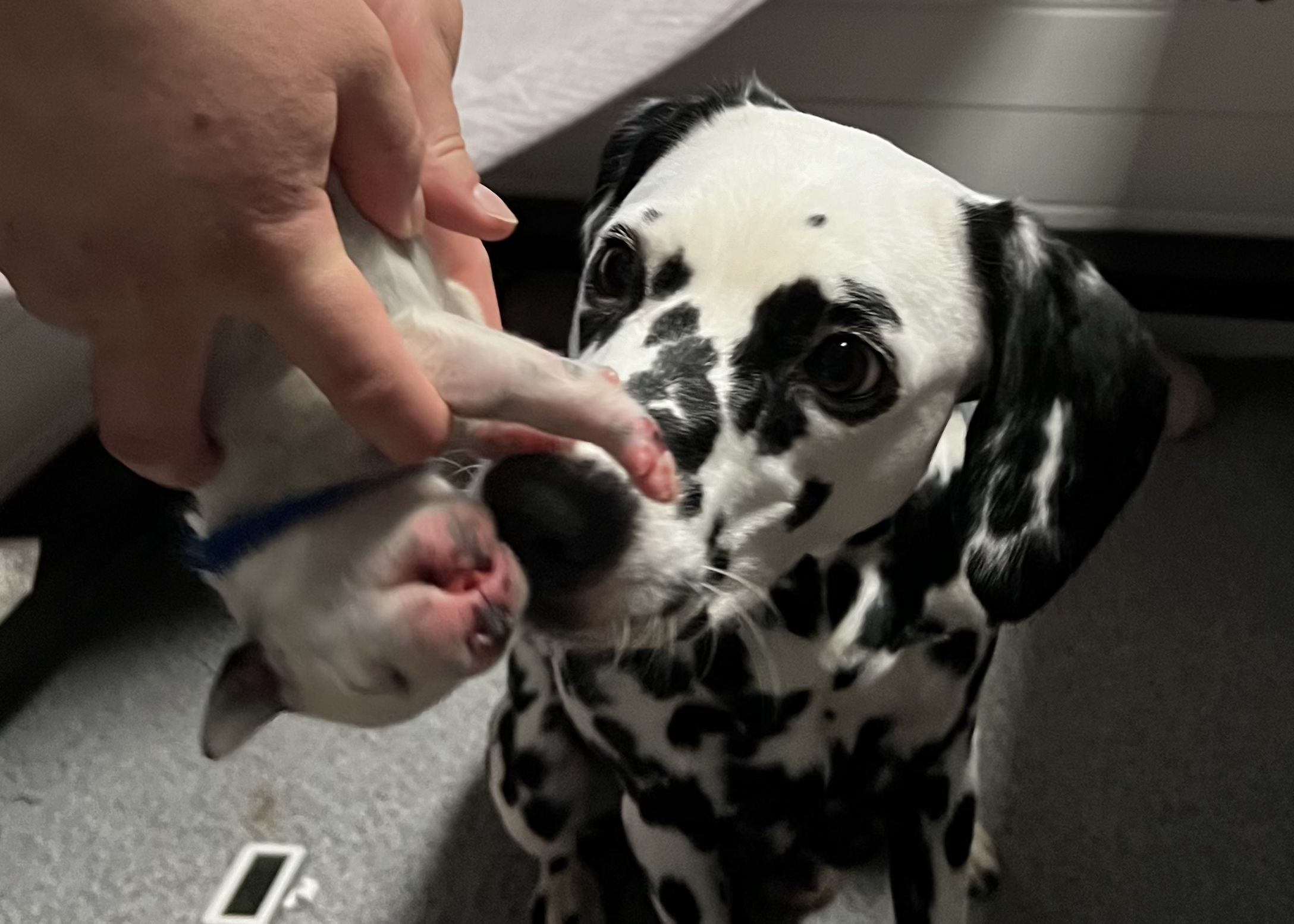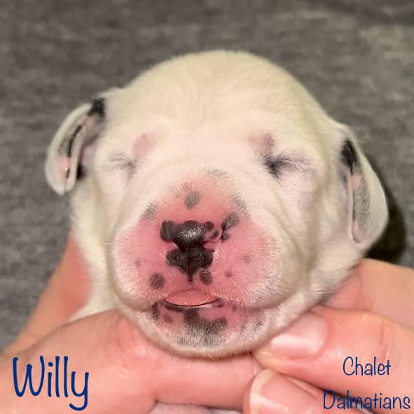 It is thought to be that Charlie and Violet are liver brown spotted puppies, which means that their marking will appear as a brown color instead of black. We are pretty excited about having some liver pups! All of the puppies will let us know for sure which color they are when they are a few days old because it can sometimes be hard to tell on newborns. Those are the two colors that are accepted by the American Kennel Club (AKC) and the United Kennel Club (UKC), which are the only reputable kennel clubs in the United States.