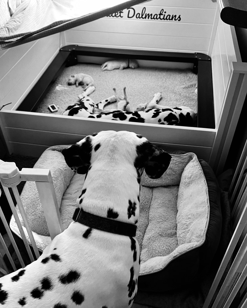 When we change the pad in the box or need to gather the puppies together for one reason or another. Tipsy is often curious and very attentive to know that they are ok and need to check on everything. Here she is making sure that everything is fine.