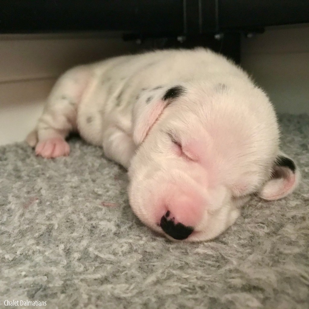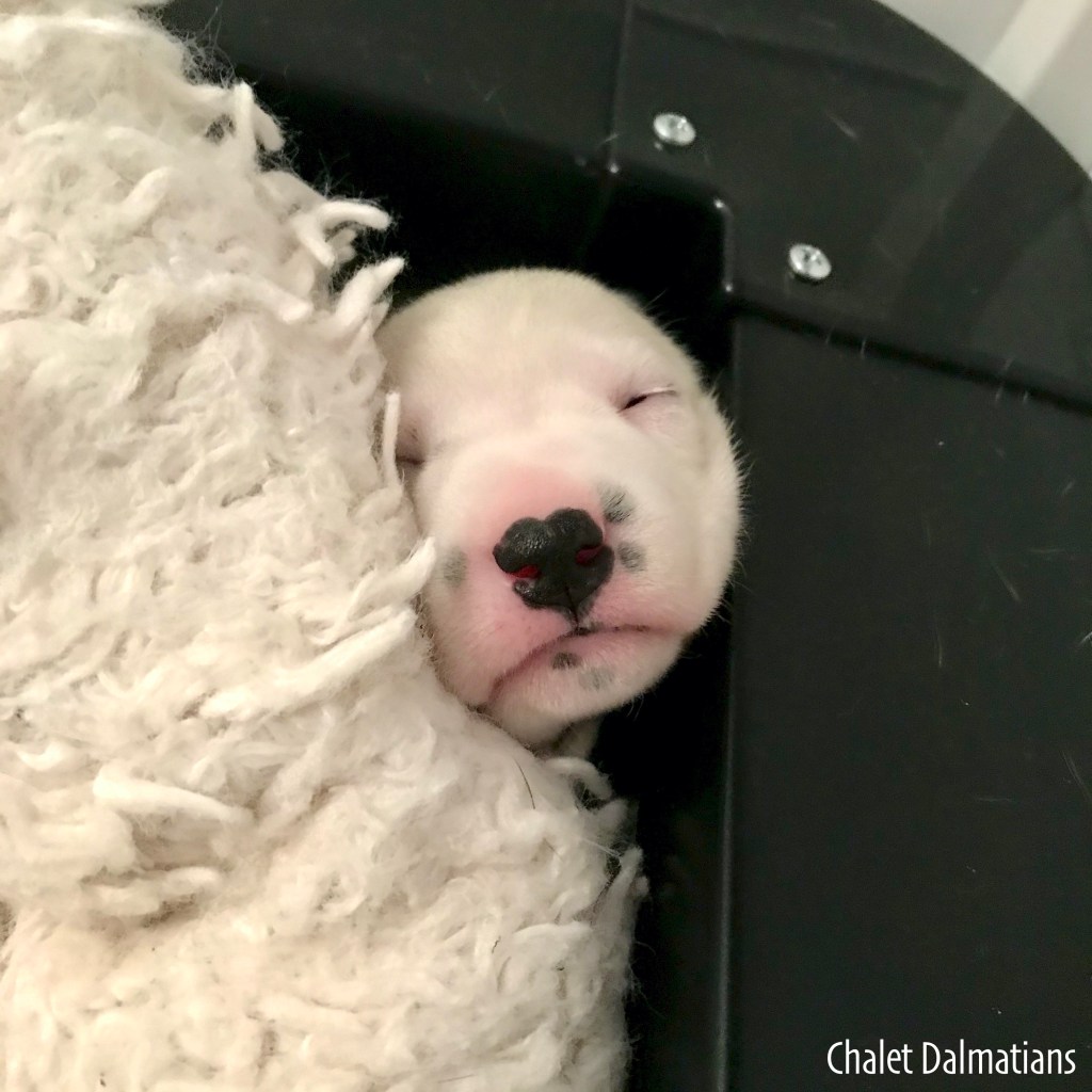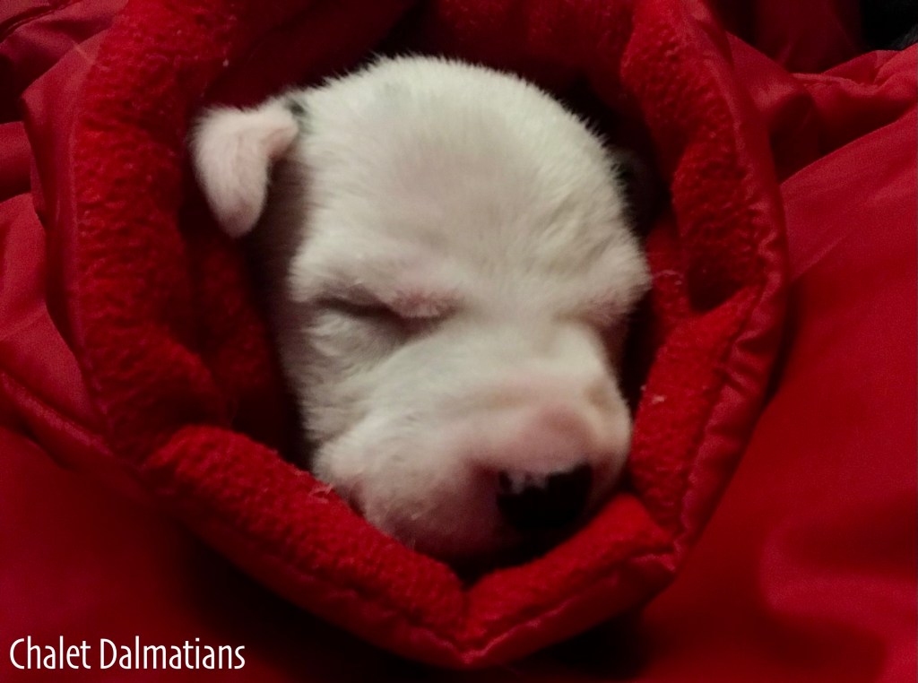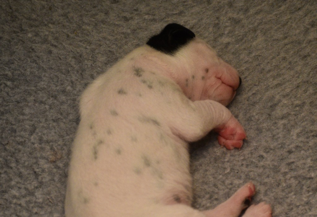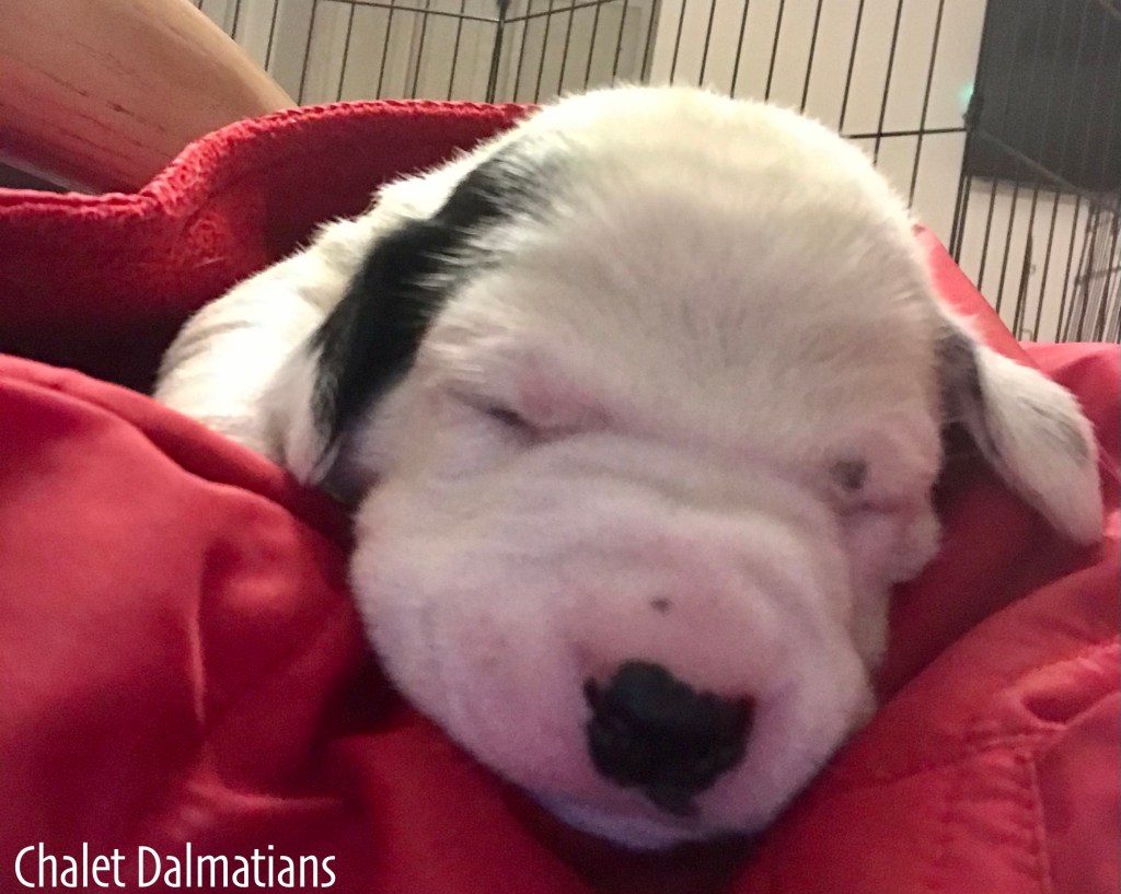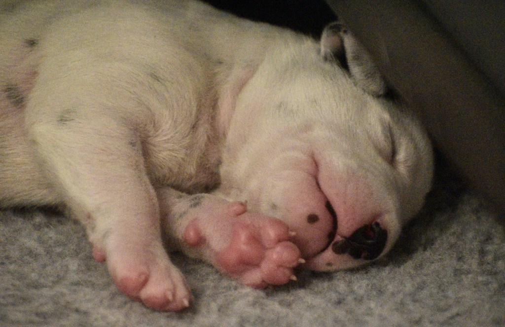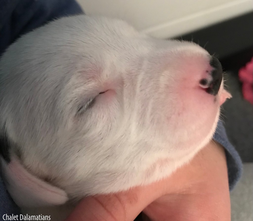 Something else that is exciting is that Jill, Sabrina and Bosley started to open their eyes today. It will be a few days before they are open all the way, but the other two puppies aren’t far behind! Since they are open, I directed the humans to not use any flash photography for about a week or so until their eyes are better adjusted. Here is Jill showing off her eyes. If you look really really close, you can see them opening in the corner!