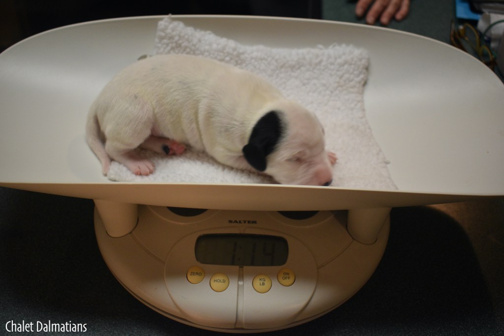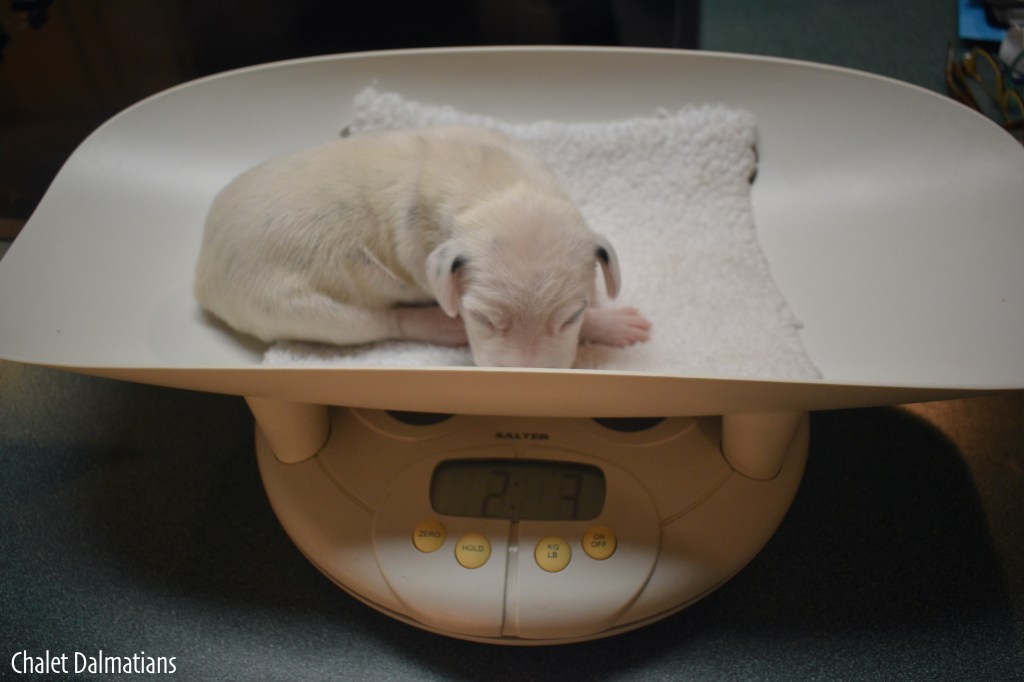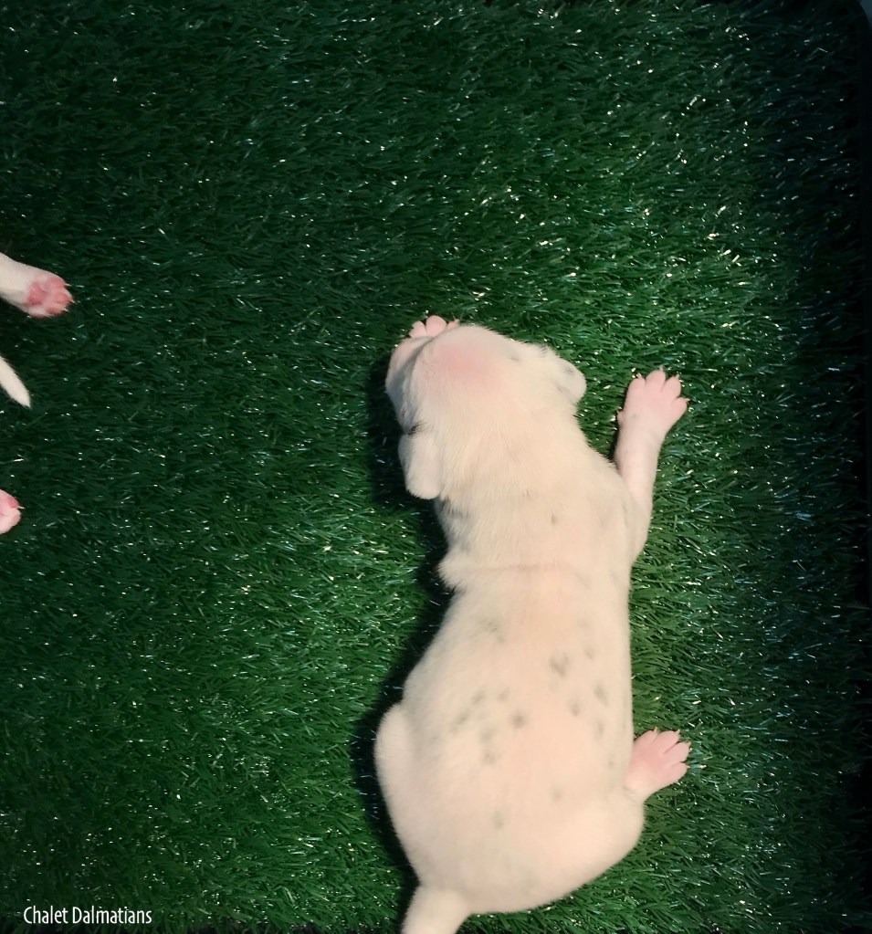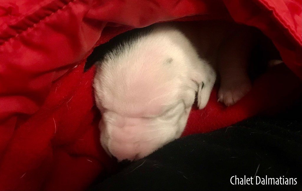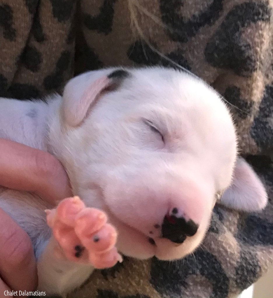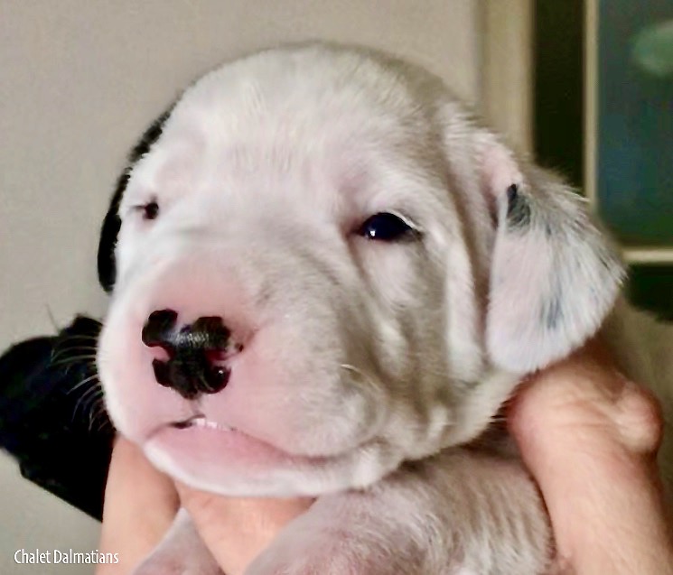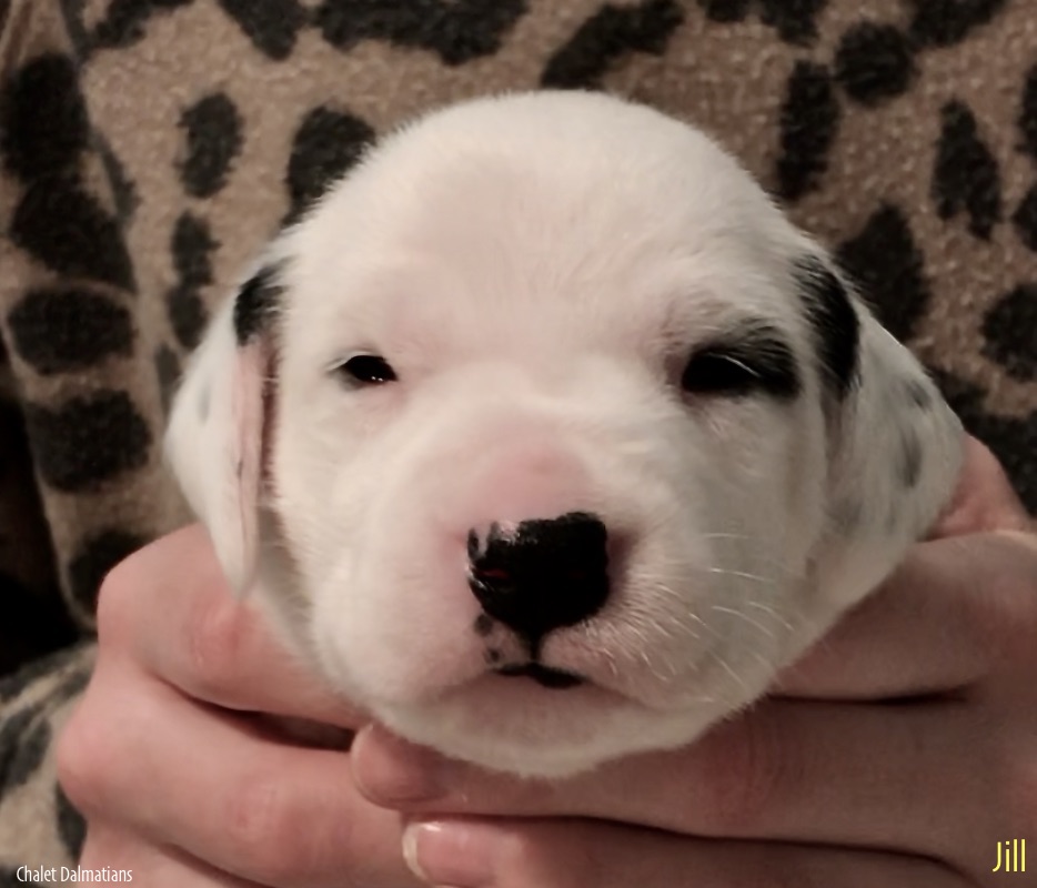 Something else that is exciting is that Jill, Sabrina and Bosley started to open their eyes today. It will be a few days before they are open all the way, but the other two puppies aren’t far behind! Since they are open, I directed the humans to not use any flash photography for about a week or so until their eyes are better adjusted. Here is Jill showing off her eyes. If you look really really close, you can see them opening in the corner!