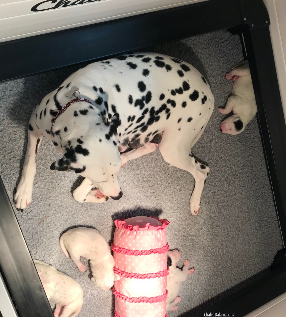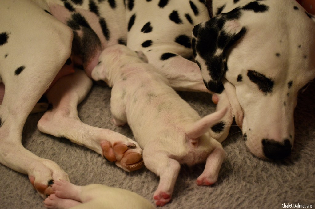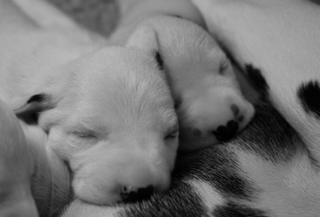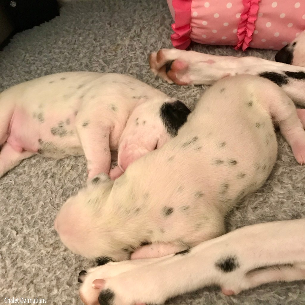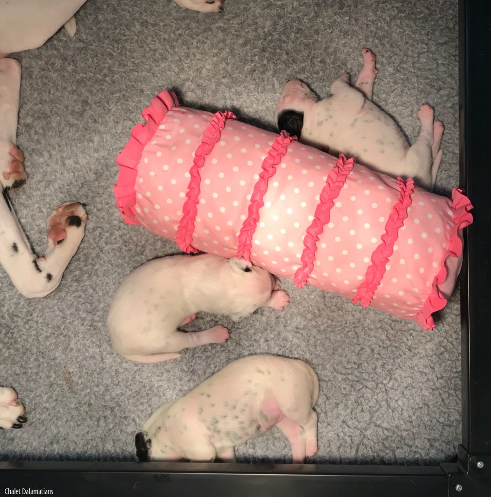 Since we came home, the humans have been playing classical music. In Puppy Culture (PC) we are supposed to listen to classical music primarily, but have listened to bits of other styles too. The classical music is supposed to help us calm down and learn to settle ourselves. Since Mom is a PC puppy too, the humans have been playing it for her. Now that we are here and because the humans have a theory about how we may be able to feel the sound waves of classical music while our eyes and ears were still closed. Nonetheless, it is beneficial regardless. Here we are with Mom right before taking a well deserved nap!