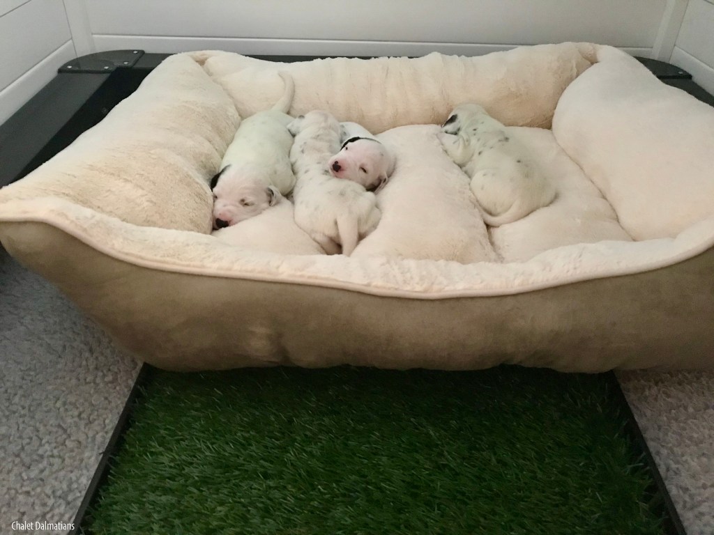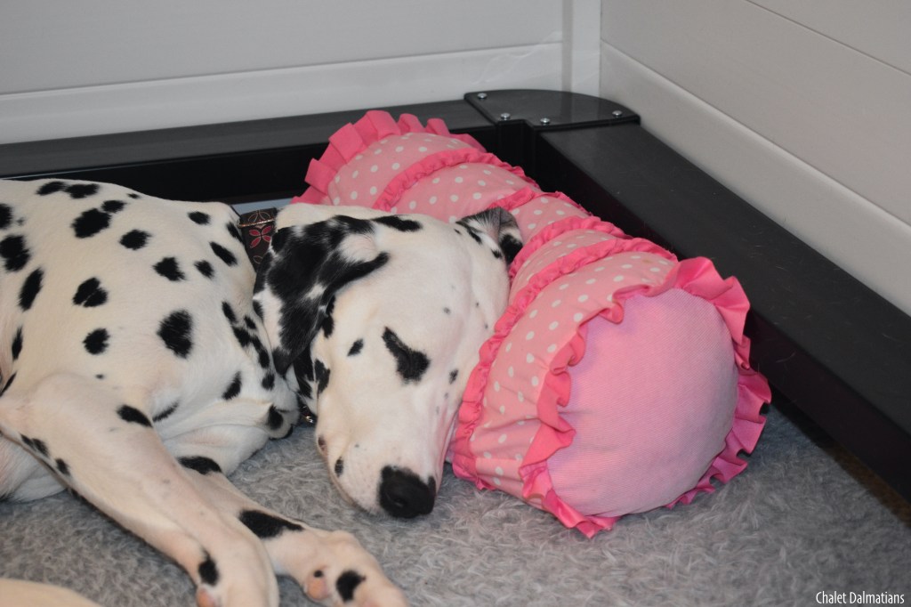We originally started out with a brand new bed, but there wasn’t enough room for Mom to lay in there with us. So we switched to this cat bed (yes…the one that the Jasper-Kimber litter was obsessed with) which is the perfect size for us four and mom to sleep nap with us too!