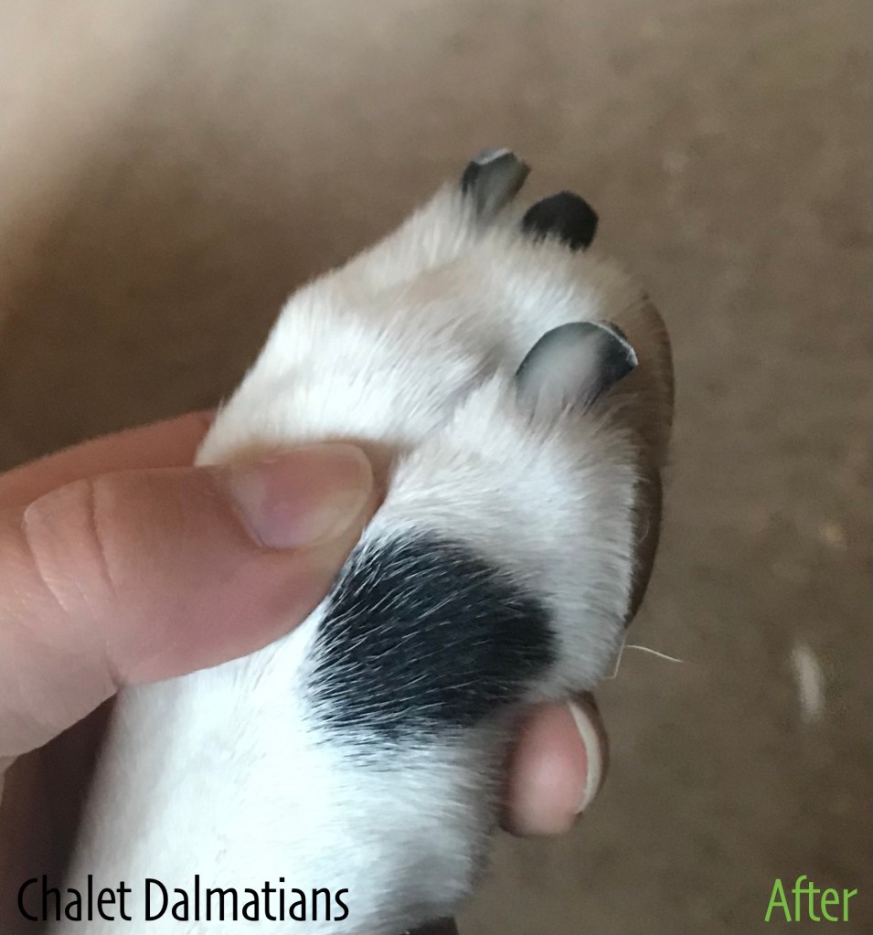 Since she is willing to leave us for a few minutes here and there, she was finally able to get her nails done. She said that this is the longest that her nails have ever been since things have been so hectic with us little ones here. Mom thinks that it is super important to have your nails trimmed at lease once a week so that your feet and body can grow properly. She says that the humans are super particular about her nails not being too long, but she doesn’t mind, because it leads to a better lifestyle for her anyways. Here are her nails before and after her nail trim today. She says that more length could have come off of them, but we shouldn’t try to take too much during one nail trim. So they will be trimmed them again in a few days.