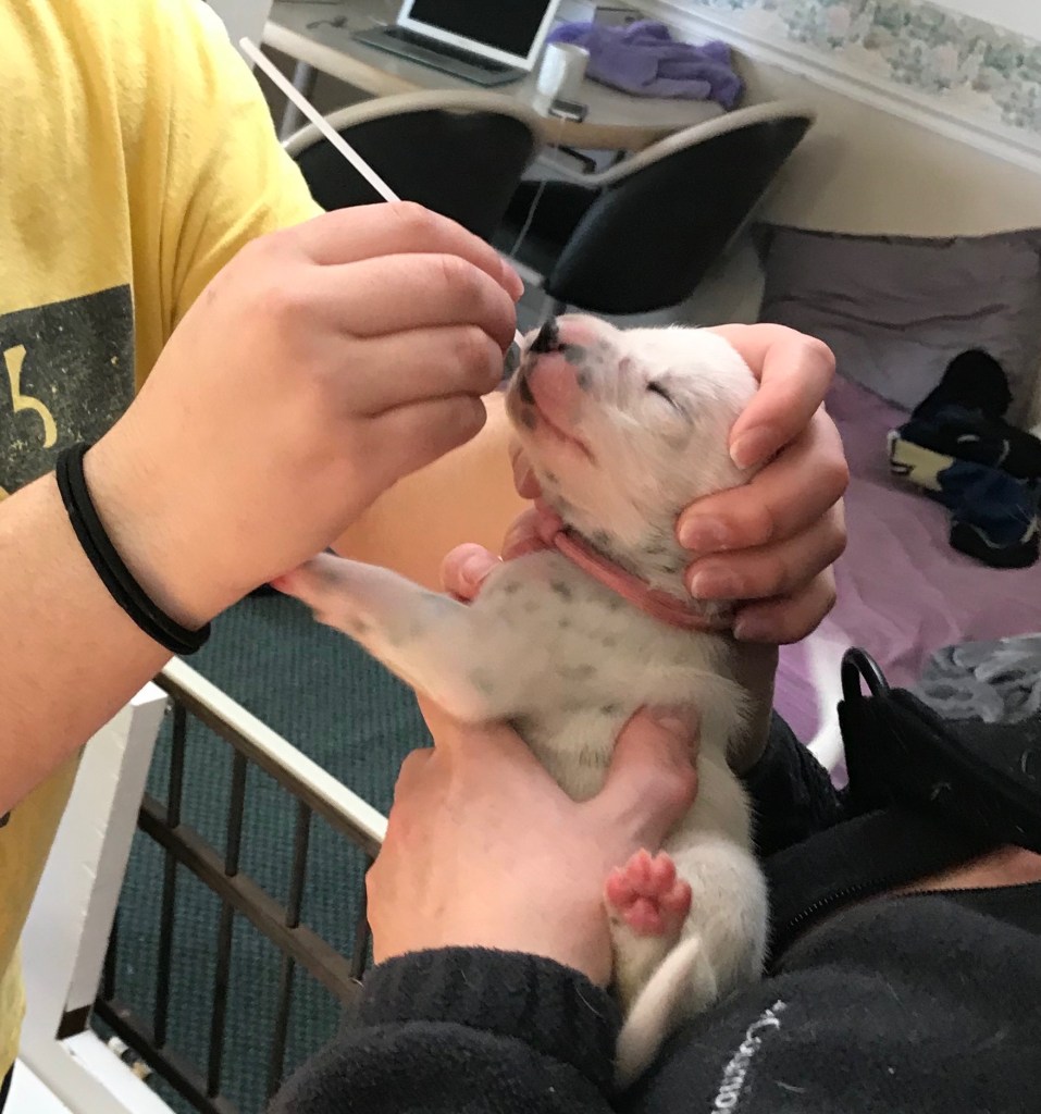 Today we received the puppies Low Uric Acid (LUA) test results. We have 3 of 9 puppies who carry the LUA gene, like Kimber. Those puppies are Biscotti, Cannoli, and Snickerdoodle. We are happy that the puppies who carry the LUA gene are the boys because they are more susceptible to block with a urate stones than a female. The way that we test the puppies is by rubbing a swab on the inside of their cheek for a few seconds.