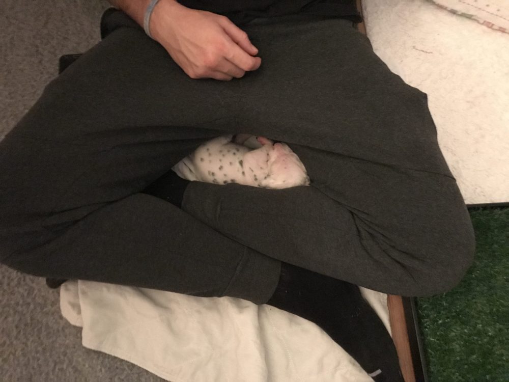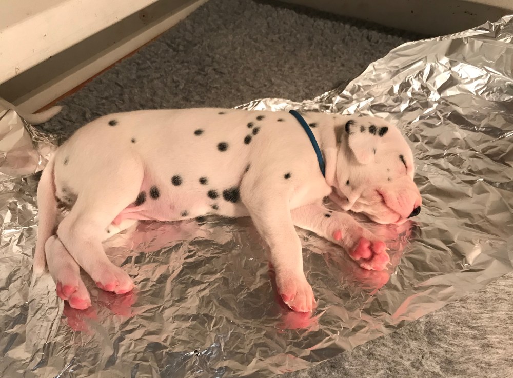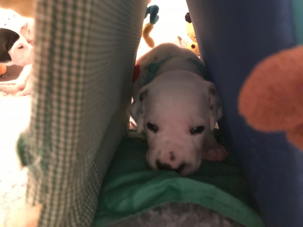 This period of the puppies lives is having us change a lot of different things in the box. We put foil down on part of the fleece for a short bit today. Everyone was pretty good with it, but as always we had some that were better than others. I didn’t manage to take a picture of this, but I will try again tomorrow if we put the foil back in for a while.