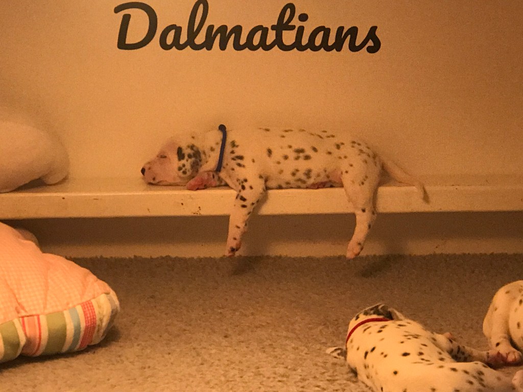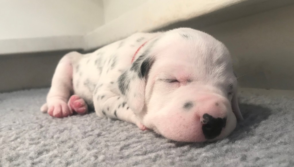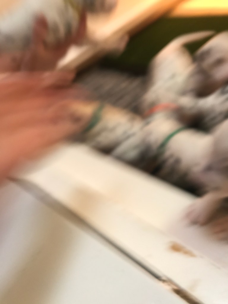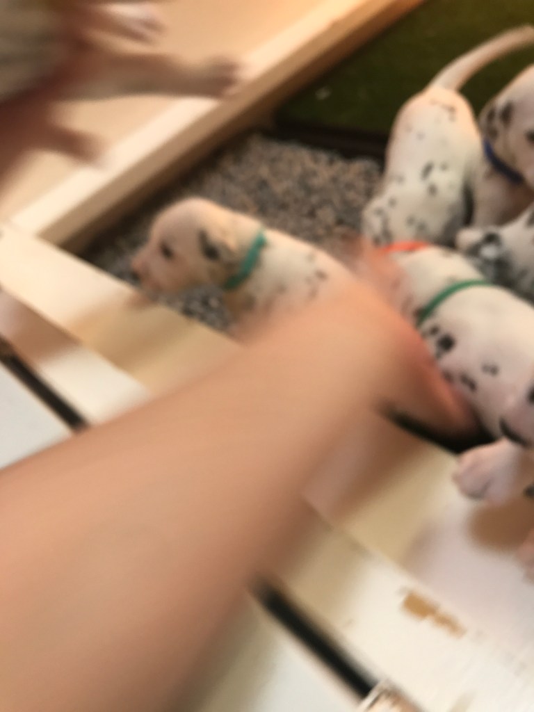We continued the Pssst (Puppy Call) Training today and added some new things since we have noticed the pups startling upon hearing sudden noises, which is perfectly normal and just means that their ears are starting to open more. Now that we see this, we start with something called startle and recovery. This is when we drop something or make a sudden sound that is loud enough for us to see the puppies jump but almost instantly recover. This is only done for a select few days just after the pups start to become startled to sudden noises. We will also start to use the blow dryer closer to the pups as well as a vacuum. During the times that we are not practicing startle and recovery, which is 99.99% of the time, we play classical music for them as it helps for them to stay clam. This can be used even after they leave us a calming mechanism.