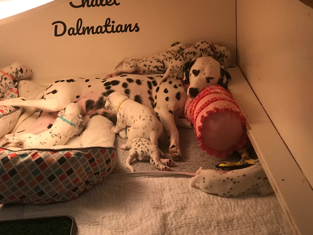 Not too many new changes today. Five of the puppies eyes are completely open now and the others are not too far away from having full vision just yet.