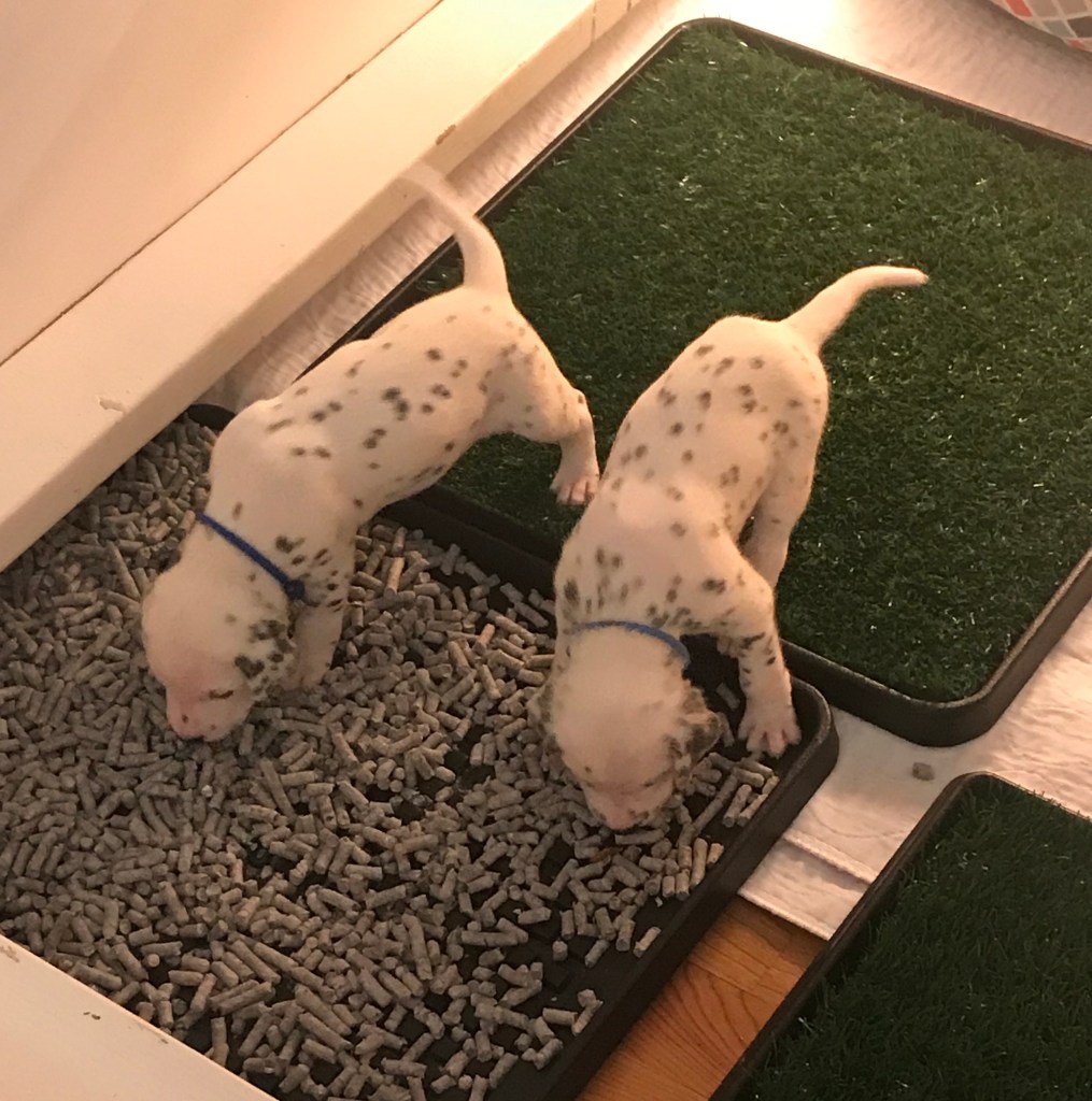 Today’s change was adding a different potty area to see how they do with it. The fake grass patches work great, we just happened to have some pellets that we introduced too late for the last litter to catch and they ended up just chewing on them, so we stuck with the potty patches instead. Since we had some left over, we thought that we would give them a try sooner in hopes that we introduced them at a young enough age that they will not chew on them if we decide to continue to use the pellets as well.