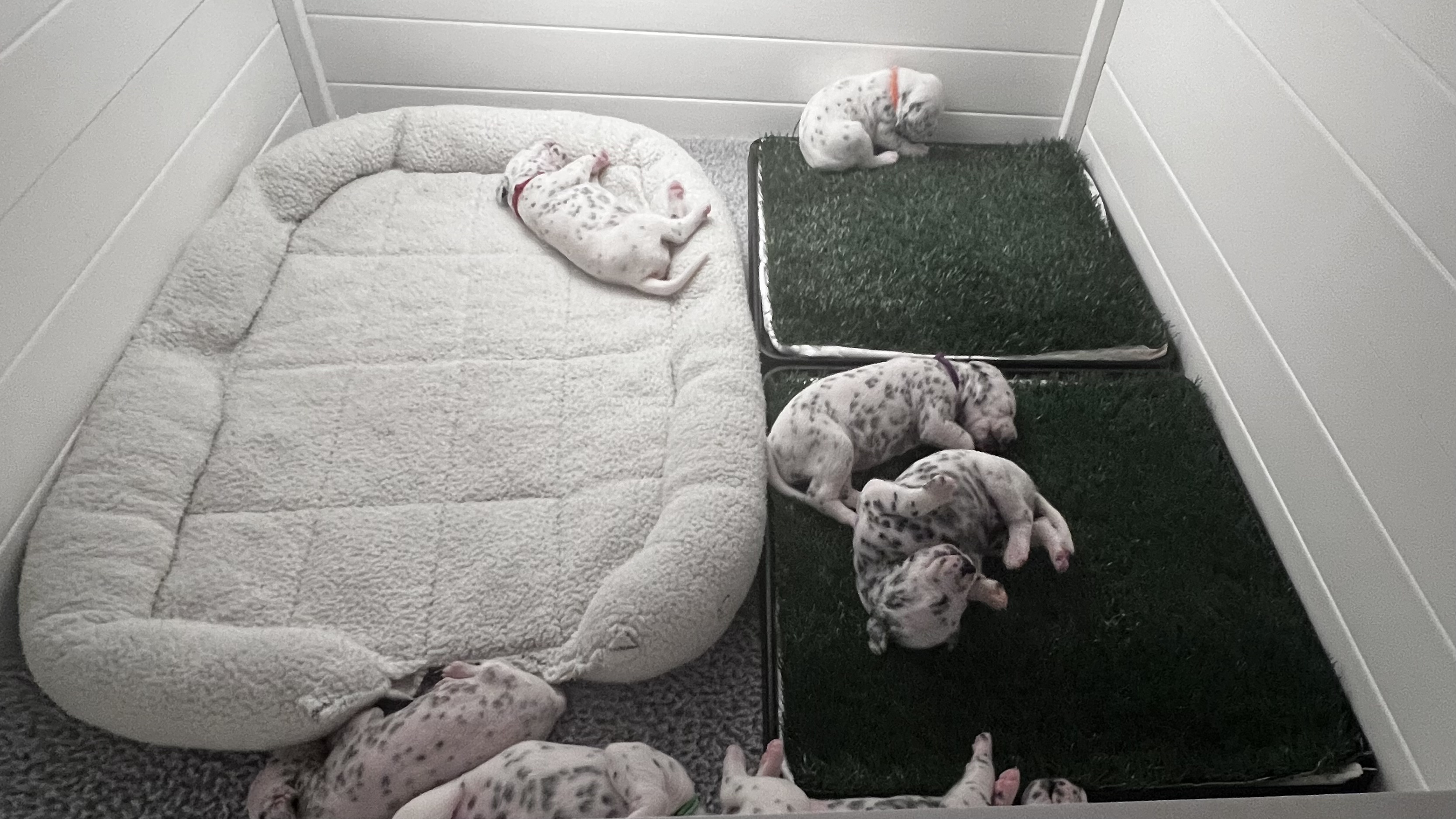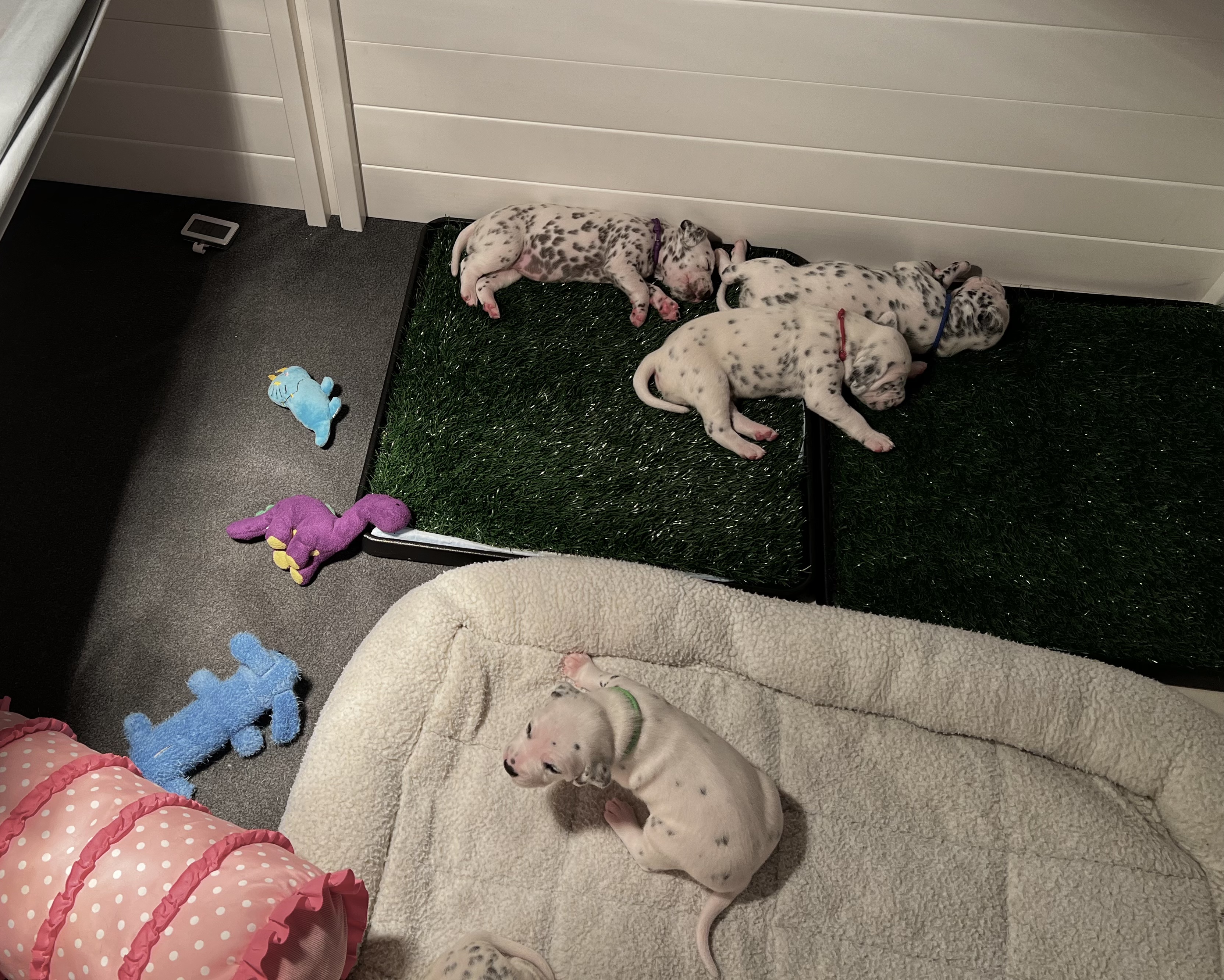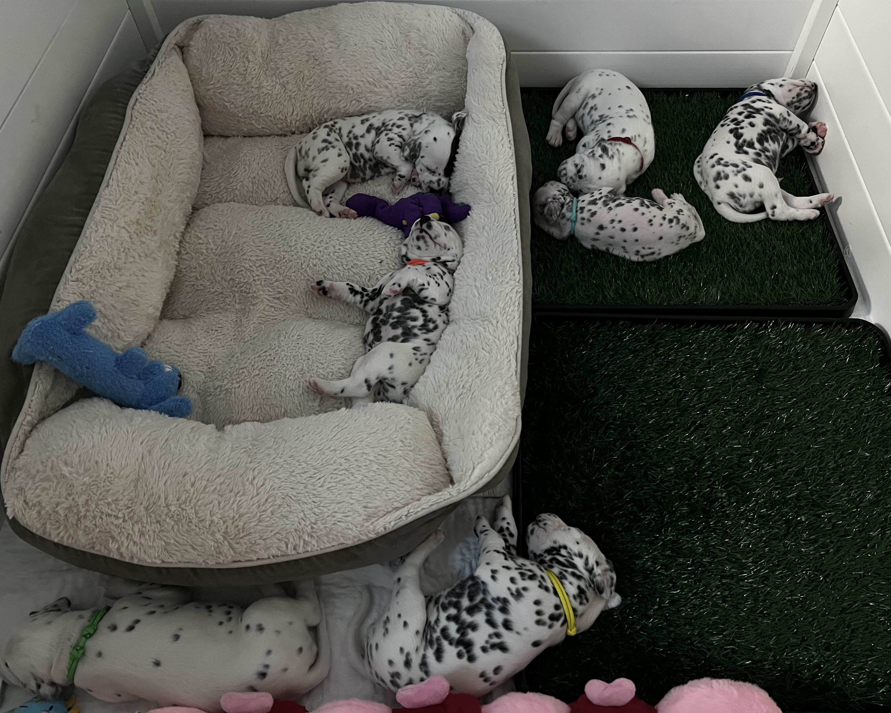 Speaking of potty patches, we have noticed more of the pups using them to potty in. We have also noticed more of the puppies taking a nap in them. When we need to move a puppy from the bed or in general, we always place them in the potty area to help them understand that that is where they do their business. Similar to when you have an older puppy that is learning to pee and poo outside. When they wake up, you take them outside even if they don’t have to go.