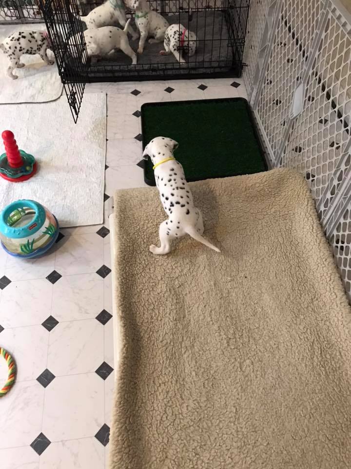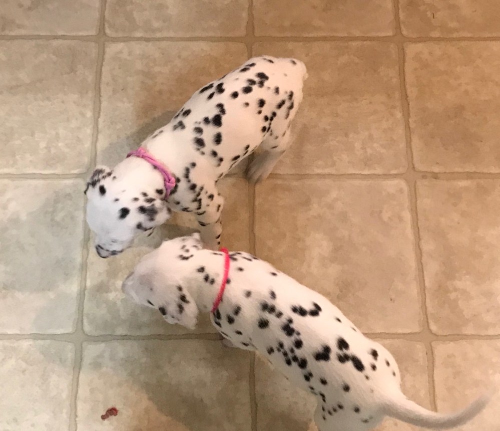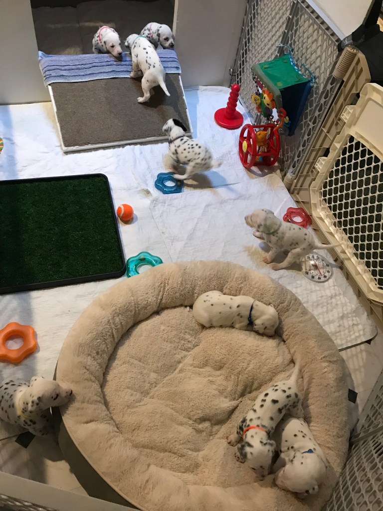 Blossom is one of the active puppies in the litter. She enjoys chewing on her siblings when they are not looking and looking at herself in the mirror. She struts her stuff as she walks by. Blossom sure is a climber. I often find her on the blue ramp that we added yesterday or on the elevated bed. I can’t wait to see how big the spot above her eye will be.