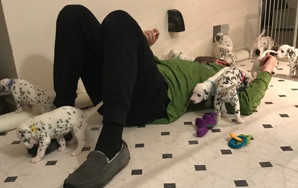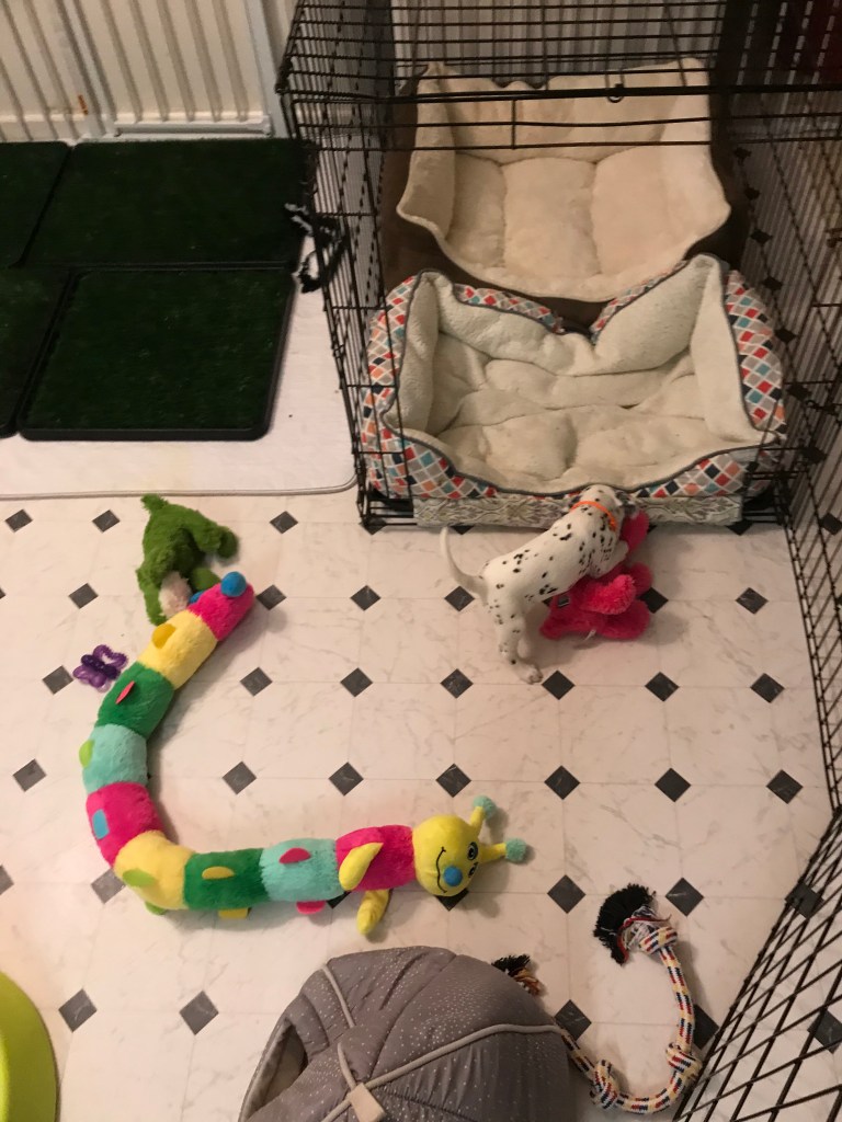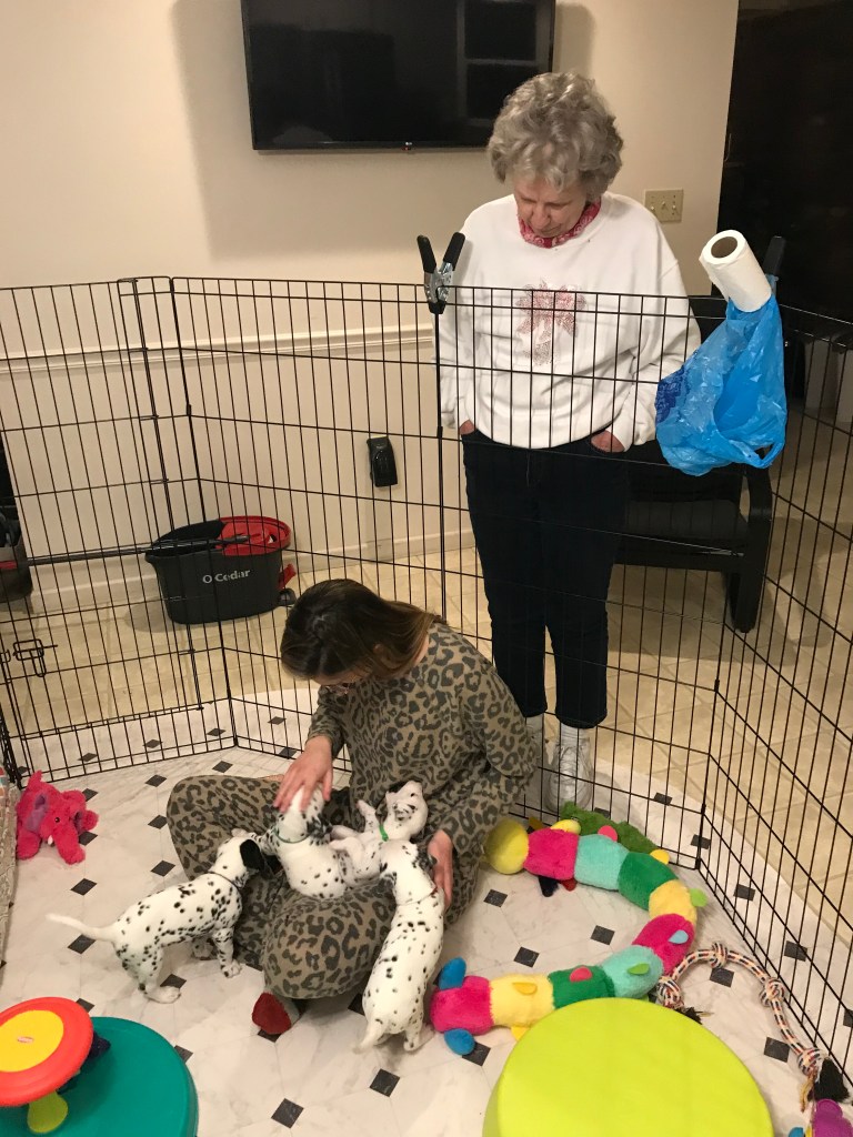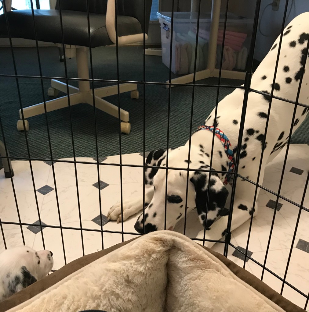 Today’s change was upgrading to a much larger play yard. The pups seem to really like the space to play and run, even though they were getting periodic play sessions, or field-trips as we were calling them, in other parts of the kitchen.