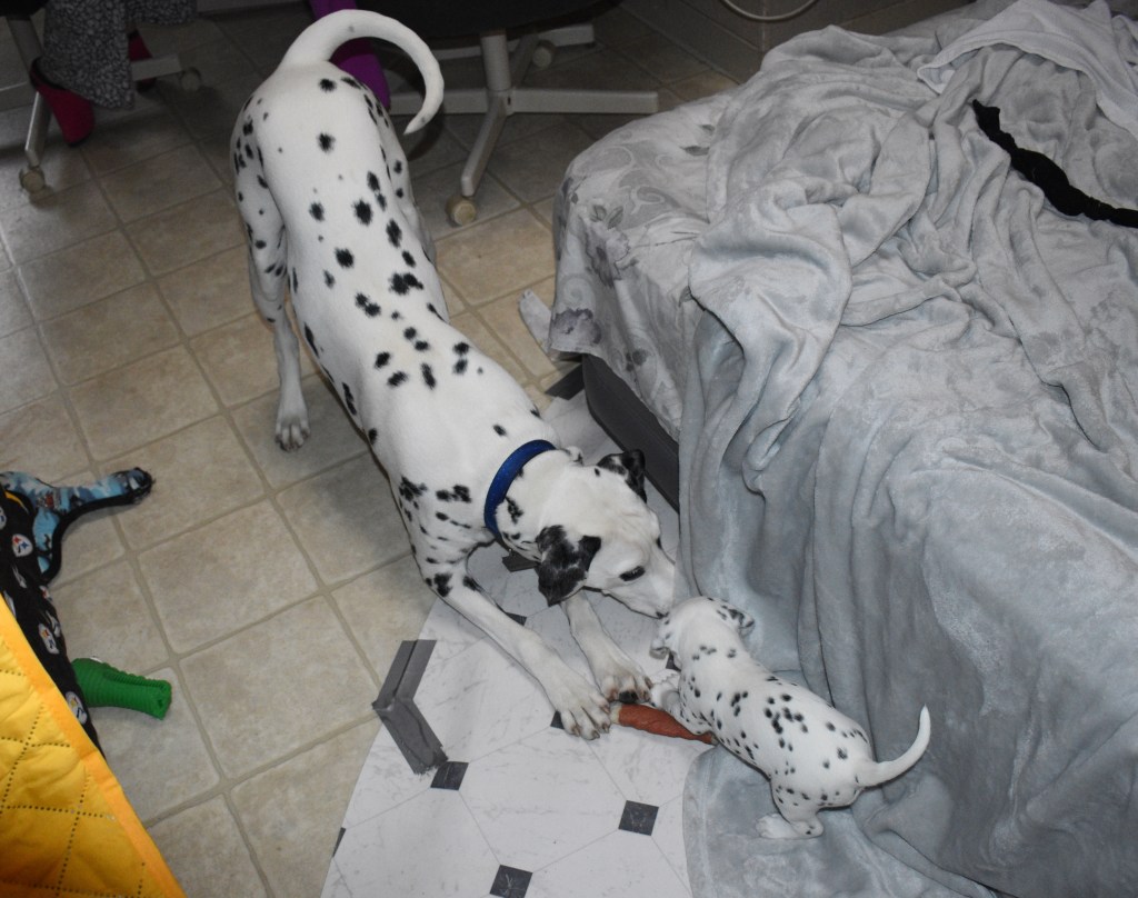 Oh…I forgot top mention that I had my turn out in the kitchen with he bog dogs. Wesson was very calm at first and them started to get a little rowdy. We each offered a little play bowl and chewed a toy for a little while!