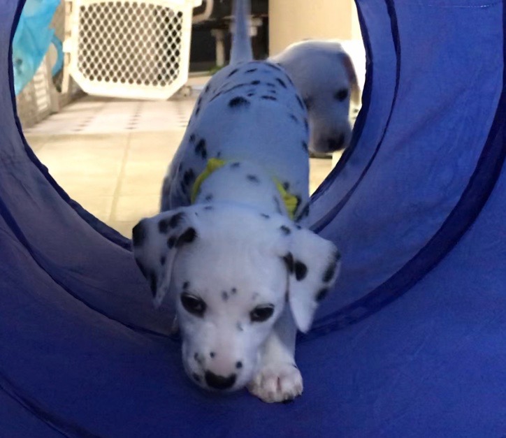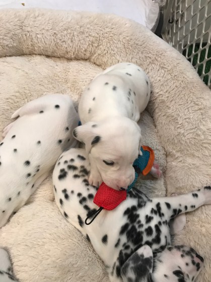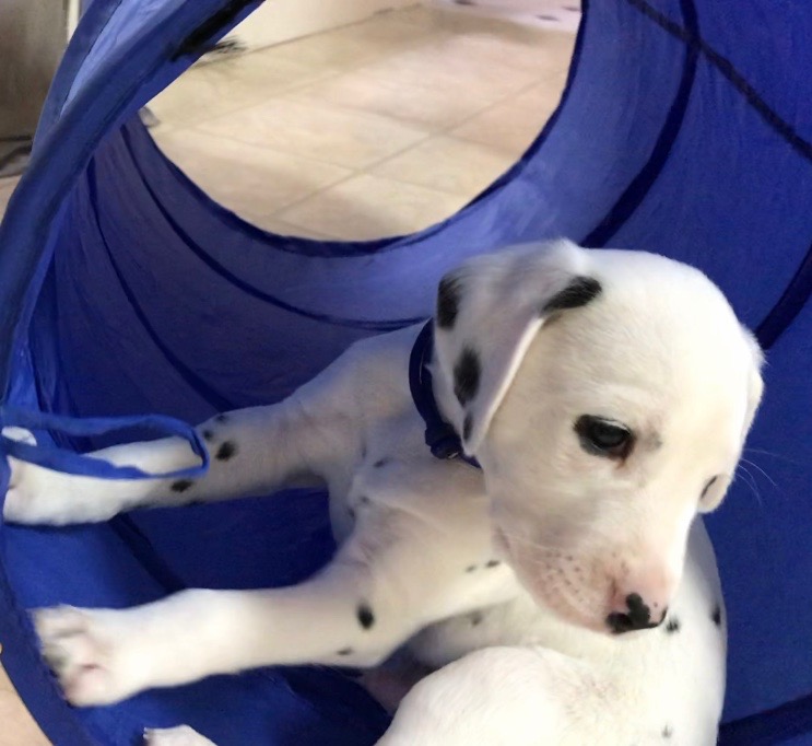 Biscotti is just like his daddy. He is very lovey and LOVES when you talk to him. Payton has chosen him as her favorite. Not only does Biscotti act like Brady, but we think that he looks exactly like him too. He seems to be the spitting image of Brady with Black spots. He is destined for a home where he can be shown. Time will tell where this pretty boy ends up.