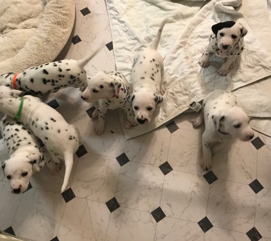 We have also started to practice manding with the puppies. This is when you don’t pick up the puppies unless they are sitting. I know, I know, it is hard, but I believe that in the long run it is more beneficial than having to wait a couple seconds. It is not only teaching them patients, but teaching them not to jump on people who want to come and say hello. After just one day I caught a picture of 4 puppies manding and one starting to sit as well.