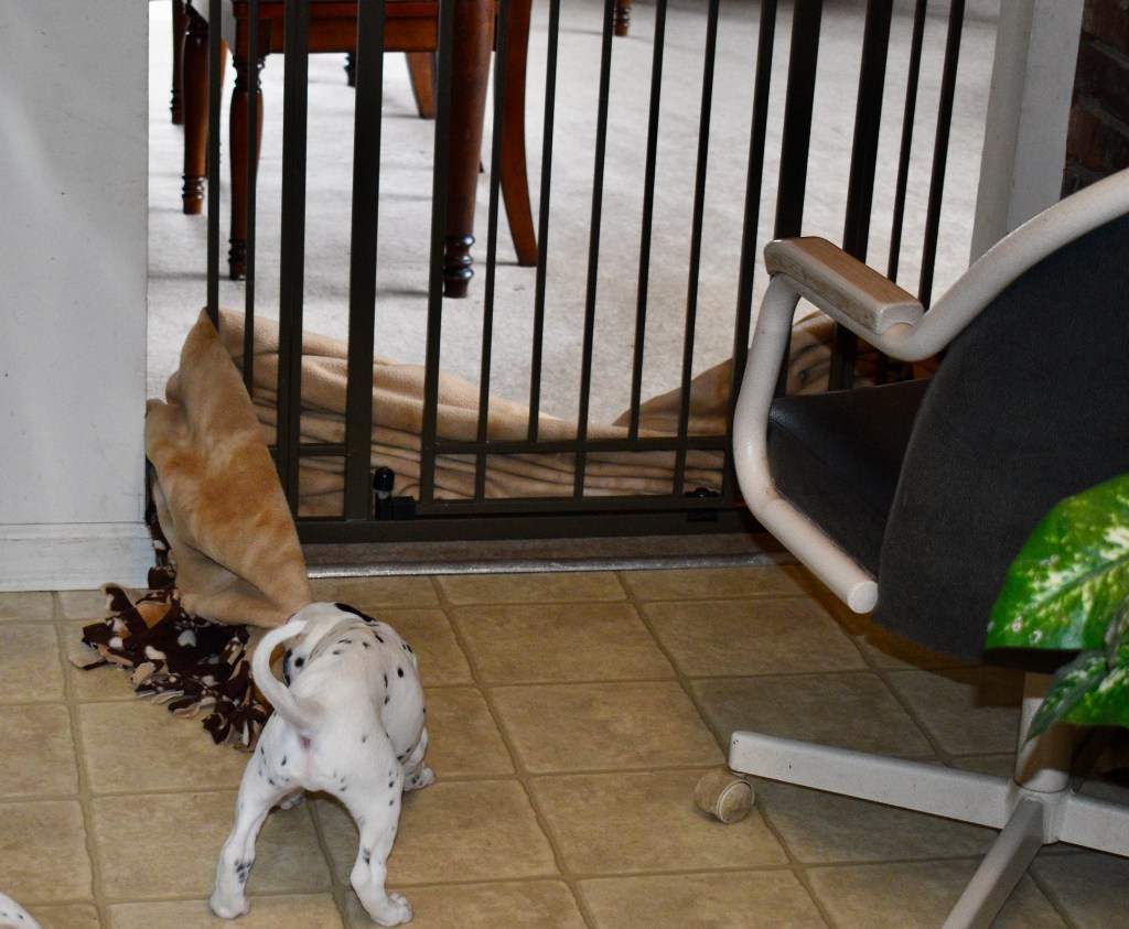 Today the humans didn’t have any plans except to get the puppies Puppy Play Time in the kitchen. Well on session number two in the kitchen, my daughter Kelly decided to try to fit through the gate that blocks off the kitchen to the dining/living room. Much to the humans surpass she fit through. Even though this batch of babies is much bigger than my other kids at this age, they still managed to fit through some of the small crevices. She was fine walking around in the living room all by herself because she didn’t make a peep. Actually she was checking things out behind my napping spot (AKA my sofa).