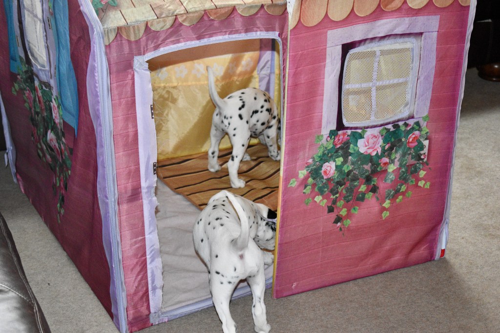 We met the play house for the first time today, but we were more into chewing it than playing in it! Some of us even drug it across the floor!