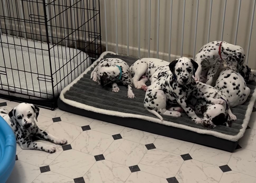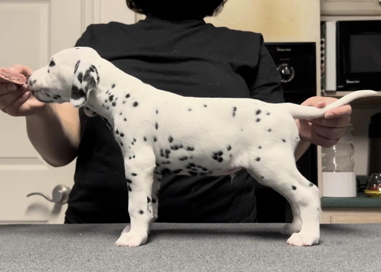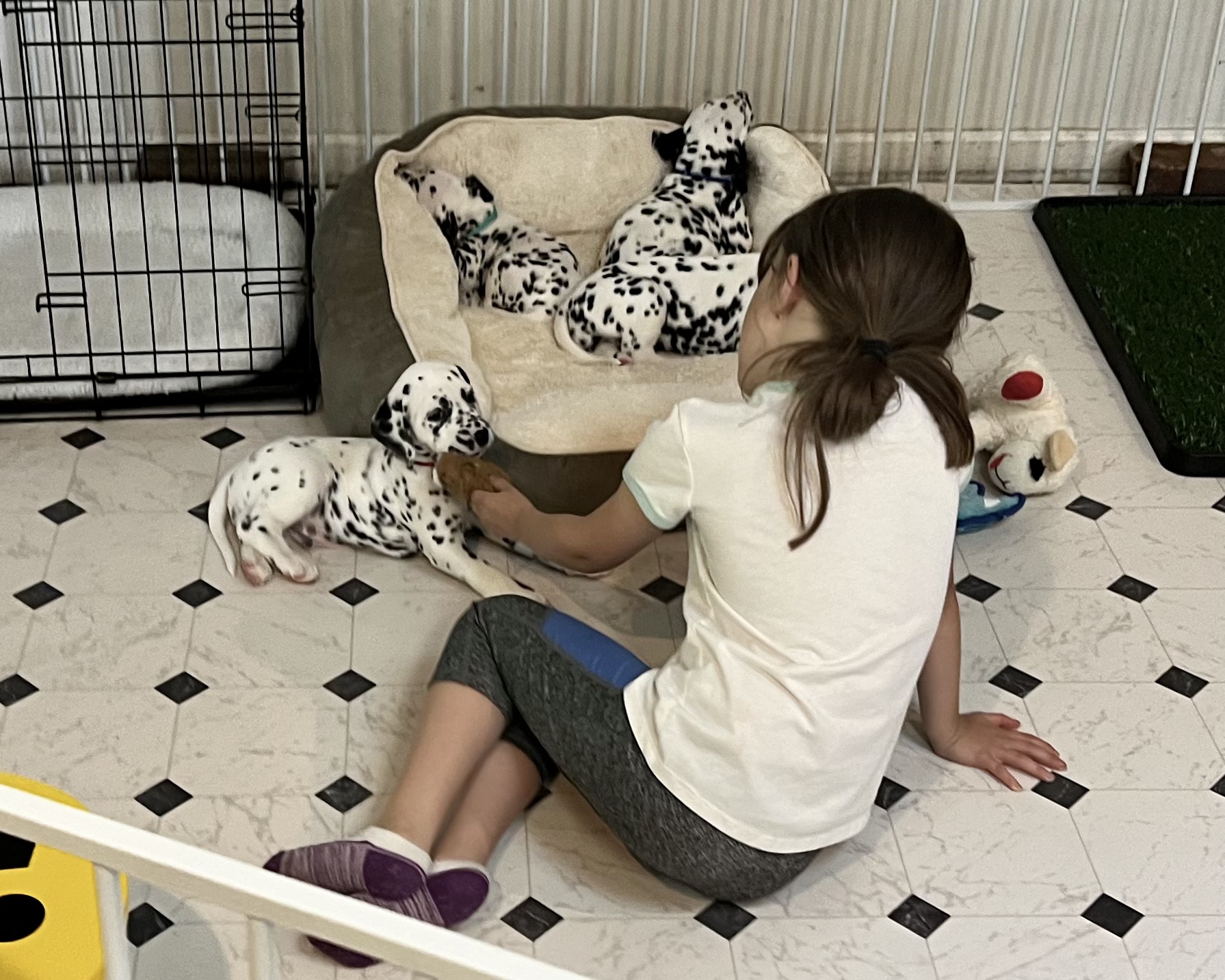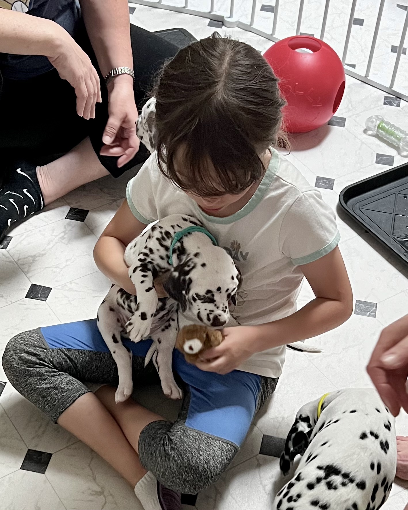 They also had a very special visitor named Mary. Her grandmother and mother were with her too for her play date with the puppies. They are good friends of ours from our local Dalmatian club. They have had Dalmatians for many many years. Mary’s favorite puppy was Charlie!
