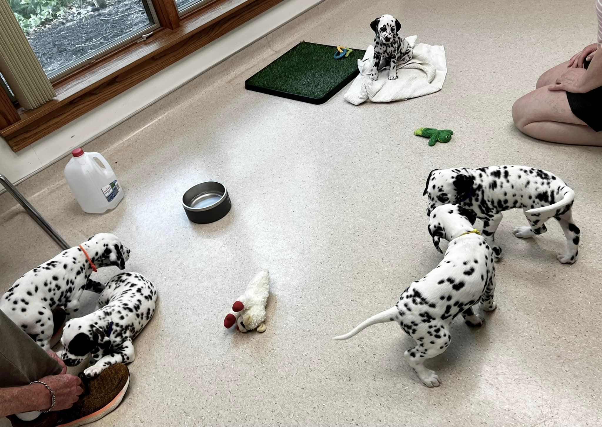 What?? Sundays aren’t for relaxing too?? Not this Sunday! Today was hearing test day around here. We had an audiologist come to our house and test the puppies hearing. As we had suspected, we have 6 bilateral hearing puppies and one unilateral hearing puppy. Charlie is our unilateral hearing pup (uni for short). There is nothing that will stop her from living a perfectly happy and 99% normal lifestyle. There may be some factors that could be very minimally life altering such as if you are calling her, she may not know where the sound is coming from or if she is sleeping on her good ear, she may not wake up right away to noise. She will make the perfect pet for someone as she is quite the sweet girl, she will just not be used in a breeding program.