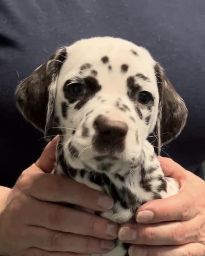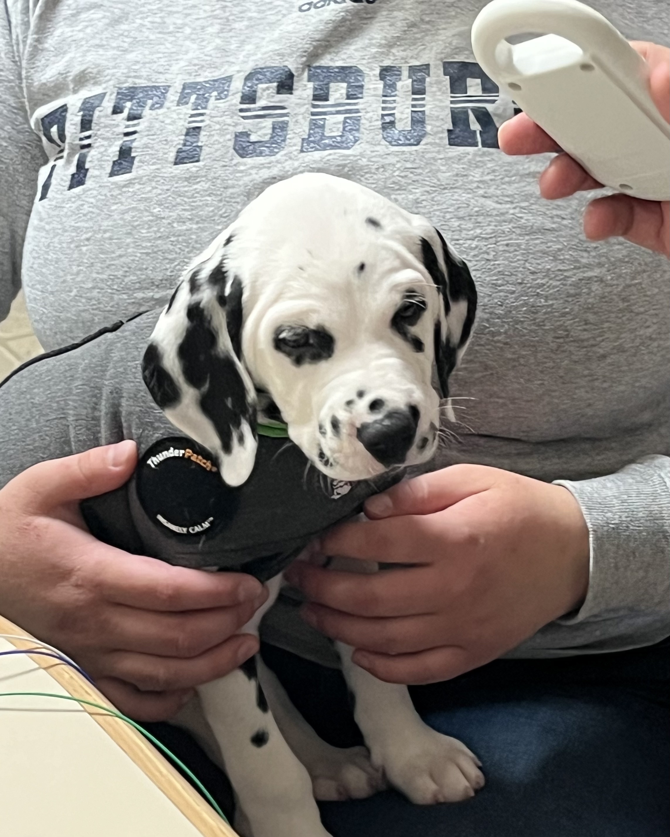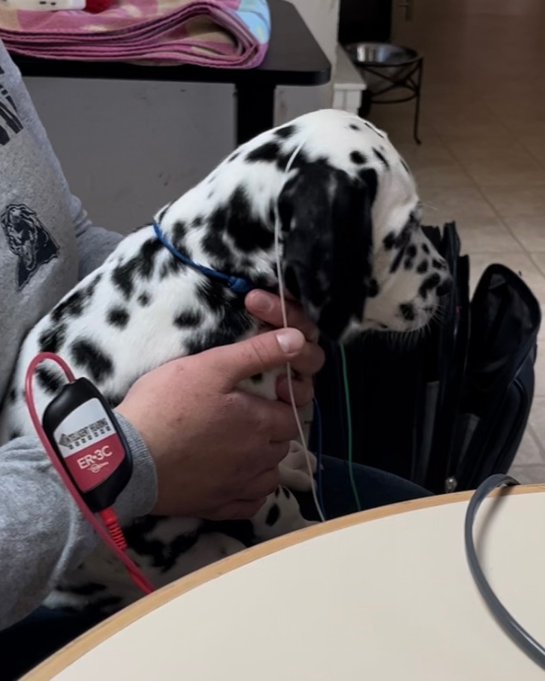 A little more about how they test for hearing of a dog versus our at home test. Our at home test is done by holding the puppy in front of us while looking the opposite direction. We suck air in making a squeaking noise to not blow air on their ear which can make them twitch. Along with our noise testing, we watch when we are calling them to see their behavior. Both of those things together are used to predict what the official test results will be. The Brainstem Auditory Evoked Response (BAER) test uses electrodes that are placed in on their forehead and close to each ear each ear to see a clear pass or fail response.