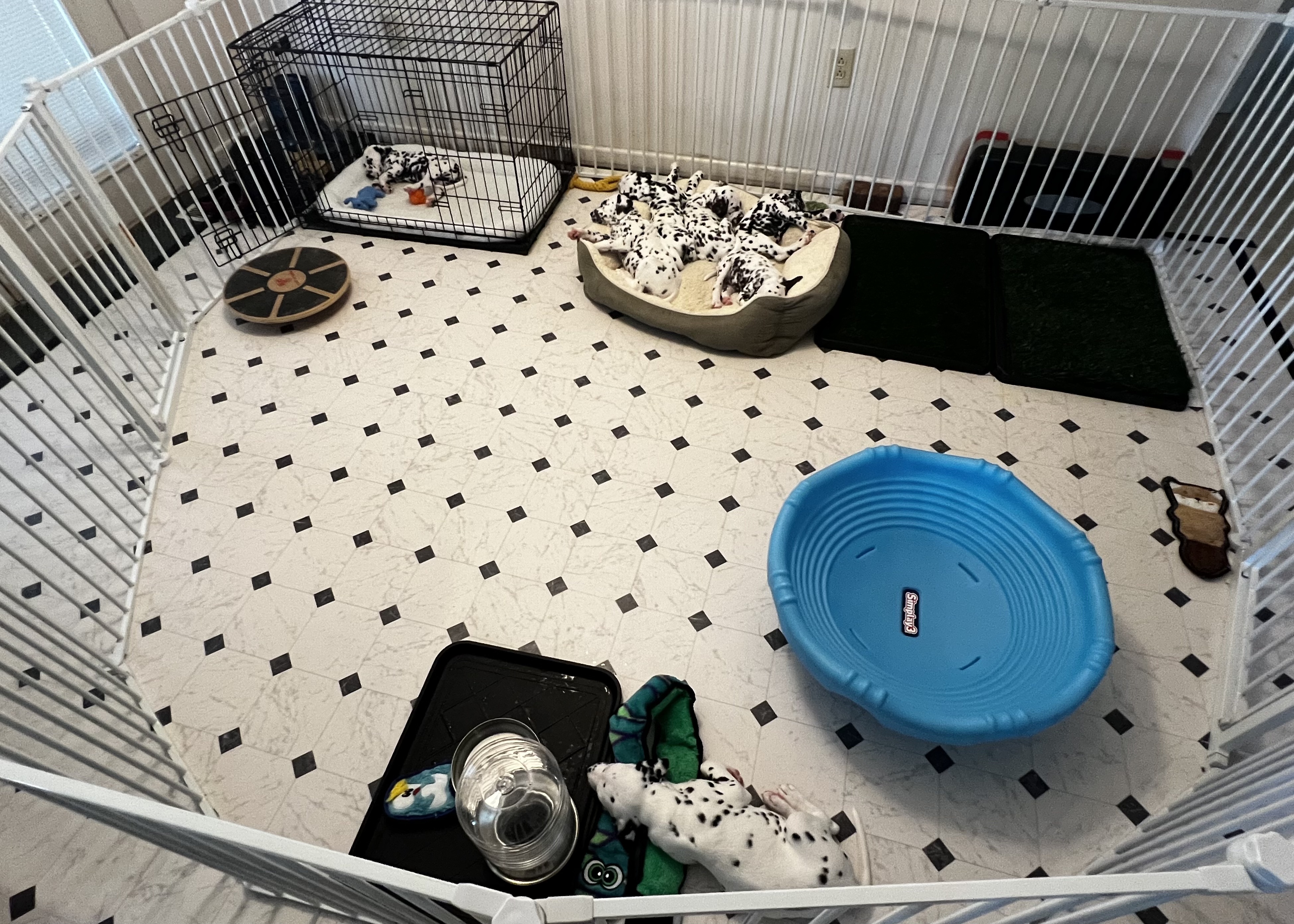 Some people suggest getting a small crate for the puppies to grow in and upgrading when they become older, but we don’t particularly suggest that. We have had success with using a medium – large size crate connected to an exercise pen and then slowly removing the space that the exercise pen provides. We use one side as a sleeping area (crate) and the other side for moving around, potty, and play.